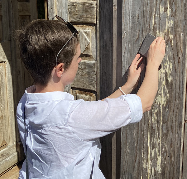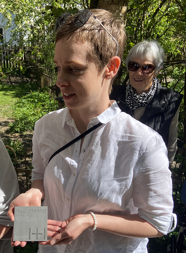 Selina Edel vom Architekturbüro Edel zeigt die Plakette …