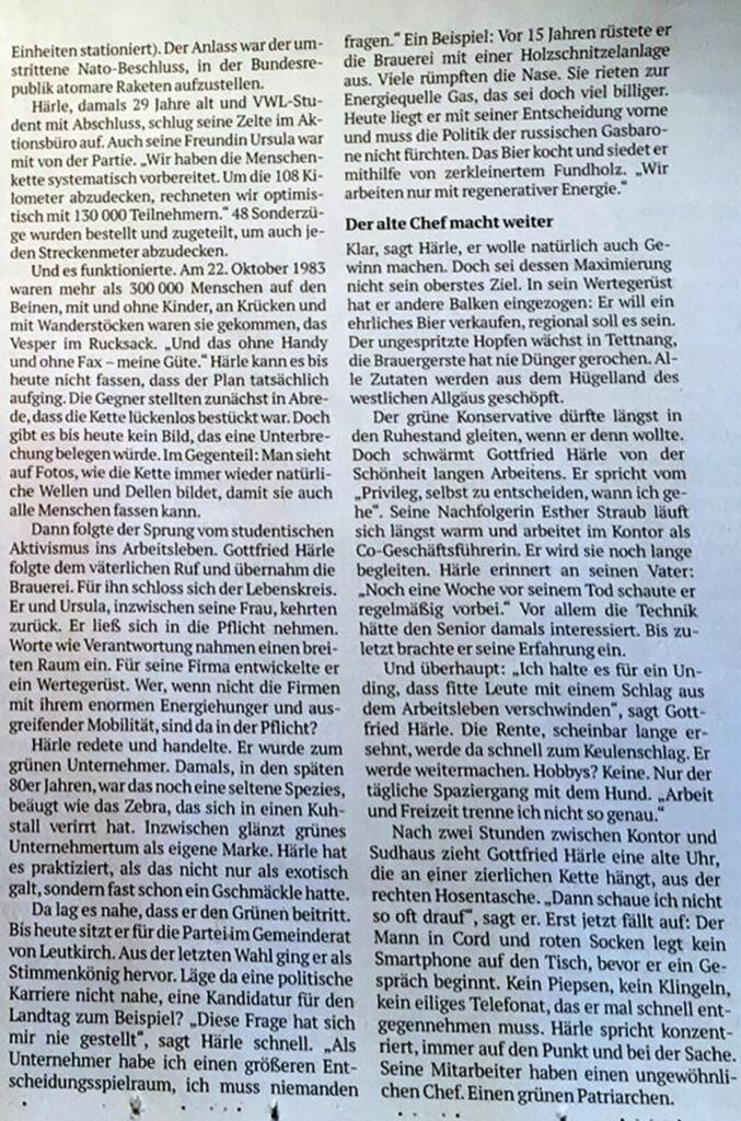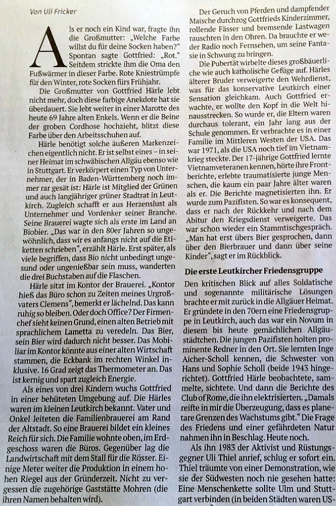 Stuttgart / Leutkirch – Gottfried Härle, Brauereibesitzer in Leutkirch, ein Ökologe der ersten Stunde und grüner Vorzeige-Unternehmer, einst ein Aktivist der Friedensbewegung, wird in der Wochenend-Beilage der “Stuttgarter Zeitung” vom 9. Dezember 2023 mit einem ganzseitigen Porträt gewürdigt. Der Text stammt von Uli Fricker, das in Leutkirch in der Brauerei aufgenommen Foto wurde von Andres Reiner gemacht. Nachstehend geben wird die Seite im Faksimile wieder (in zwei Teilen):