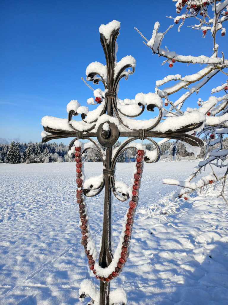 An diesem Feldkreuz wurde eine Kette aus den Früchten des danebenstehenden Baumes angebracht. 4.1.25 (bei der Waldkapelle).
