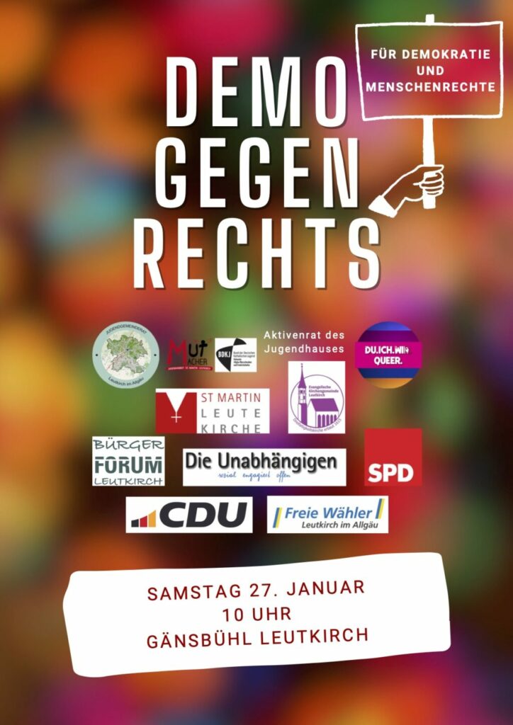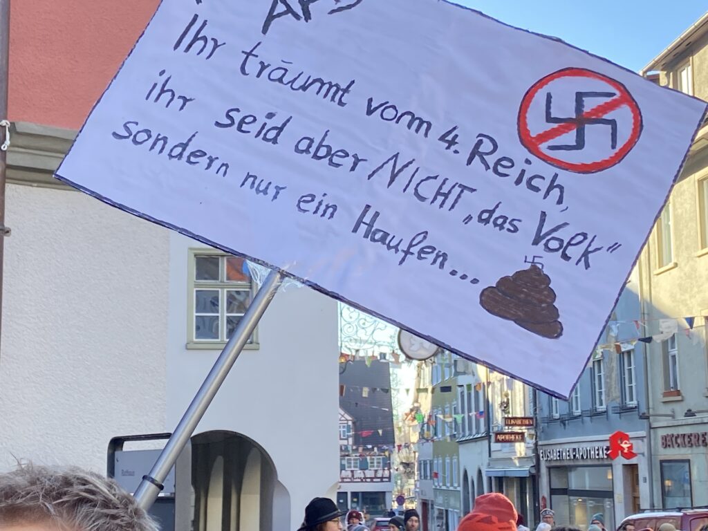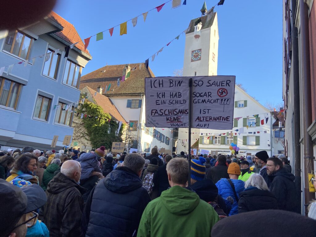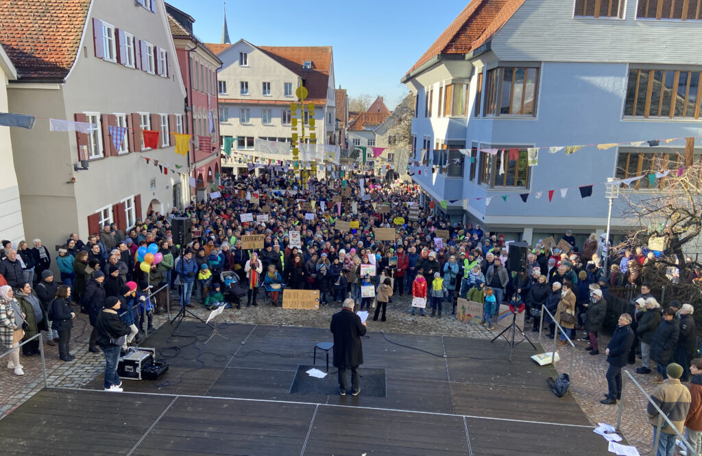 Leutkirch – Samstag, 27. Januar, Gänsbühl: Demo gegen Rechts. Eine Veranstaltung, die einer der Redner, Oberbürgermeister Hans-Jörg Henle, ein „Zeichen für Demokratie und Menschlichkeit” nannte. Zwischen der Freiluft-Plattform des Cafés „Bock” und einschließlich der Marktstraße drängten sich Hunderte Teilnehmerinnen und Teilnehmer. Eine genauere Zahl will das Polizeirevier Leutkirch auf Anfrage der „Bildschirmzeitung „Der Leutkircher“ am Montag nennen. Mehrmals mahnten Sprecherinnen und Sprecher am Veranstaltungs-Mikrophon den Artikel 1 des Grundgesetzes an: „Die Würde des Menschen ist unantastbar.” Schriftsteller Imre Török bezeichnete die AfD als “Antidemokraten für Destruktivität”. Jugendgemeinderätin Melissa Altergott forderte „Brücken der Verständigung“. Unser Reporter Julian Aicher berichtet.