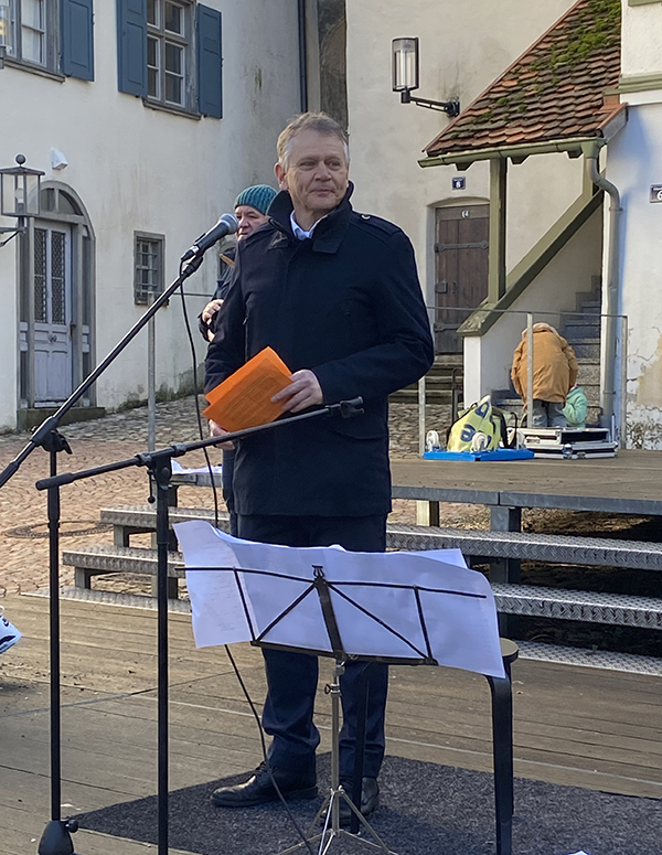 Oberbürgermeister Hans-Jörg-Henle spricht am 27. Januar auf dem Gänsbühl bei der “Demo gegen Rechts”.