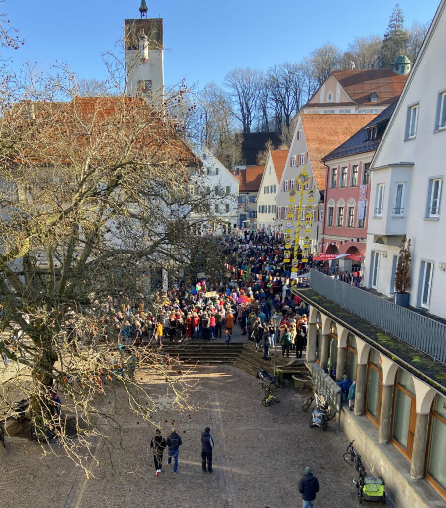 Bei der Kundgebung unter Fasnets-Fähnchen über dem Gänsbühl zeigten sich vereinzelt auch einige Hästräger. Einer der Veranstalter – Leutkircher Jugendorganisationen, Kirchengemeinden und die Gemeinderatsfraktionen – lobte, dass die Narrenzunft „Nibelgau“ sich „solidarisch mit unserer Veranstaltung” erklärt habe.