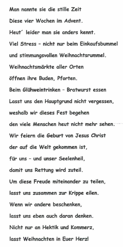 Leutkirch – Im Schaufenster von Stör & Wagenseil in der Evangelischen Kirchgasse 1 ist seit kurzem eine Weihnachtskrippe ausgestellt. Unter der Krippe ist ein Gedicht zu lesen. Es stammt aus der Feder von Beate Stör. Die Krippe (nicht die Figuren) stammt aus dem Nachlass der Leutkircherin Agnes Schöpf. Sie wurde im Elektro-Museum von Manfred Stör abgegeben. Manfred Stör meint, dass die Krippe von der Familie Schöpf selbst in Heimarbeit gebaut worden war. Nachstehend das Gedicht, das mit der Zeile schließt: Lasst Weihnachten in Euer Herz!