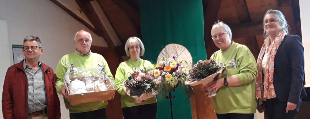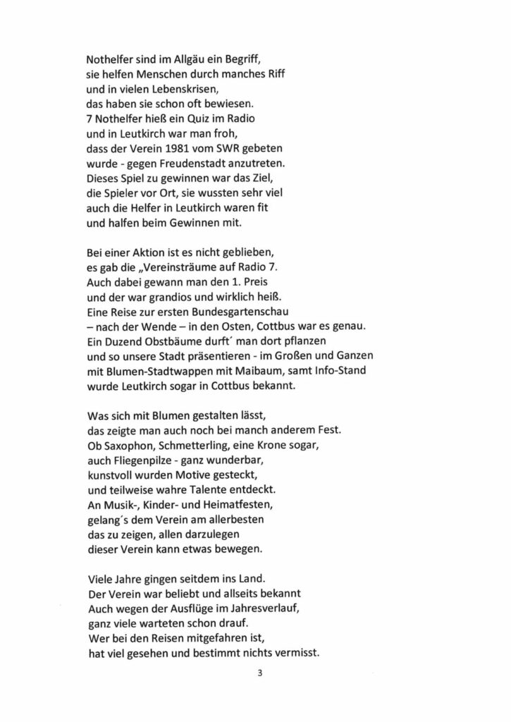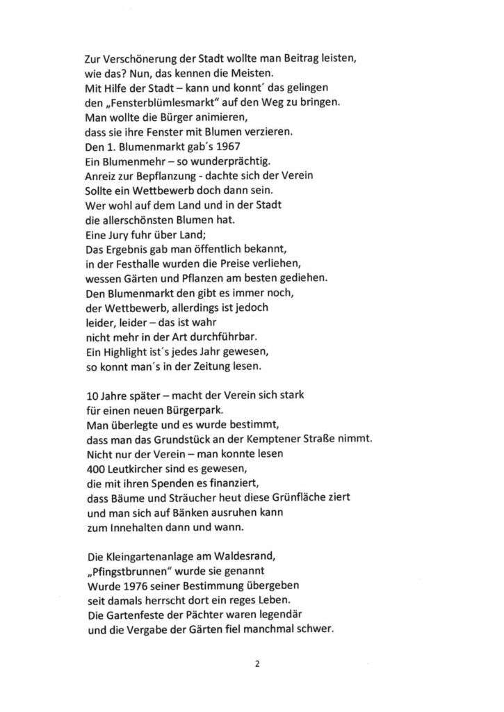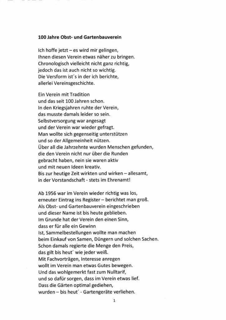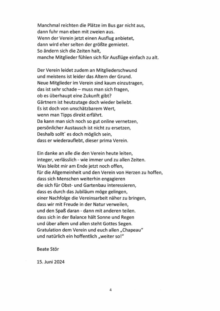 Eben diese Leistungen hat Vereinsmitglied Beate Stör in Versform gereimt und zusammengefasst. Während ihres Vortrages war es im Saal mucksmäuschenstill. Alle hörten ihr gebannt zu. In ihrem Abschlussreim hat sie auch den Mitgliederschwund, meist altershalber, erwähnt und den Mangel an jüngeren Leuten, die sich für Obst- und Gartenbau interessieren und sich in diesem Verein engagieren würden. Das Gedicht ist zum Herabladen hier im “Leutkircher” unter Download hinterlegt (im PDF-Fomrat). Wir haben es auch im jpg-Format am Schluss des Artikels eingeladen.