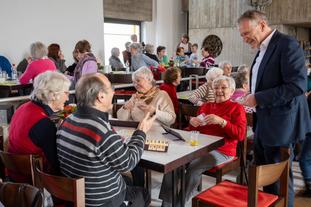 Beim Treff “Herzenswärme” in der Dreifaltigkeitskirche wurde auch gerne gekartelt. OB Henle erkundigt sich nach dem “Spielstand”. Foto: Stadt Leutkirch