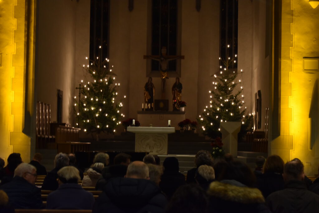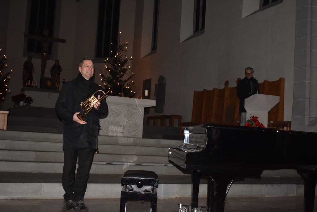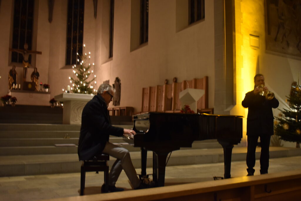 Dann konnte man die Augen schließen, träumen und sich hinwegtragen lassen von einfühlsamer Musik aus einer Orgelsonate für Trompete und Orgel von J.G. Rheinberger; es war wie ein Eintauchen ins Meer der Klänge. Nochmals gab es eine erfrischende Toccata von Denis Bedard, ein neuzeitlicher Komponist, 1950 geboren. Das bekannte Stück „Air“ von Henry Purcell begeisterte mit dahinfließender Melodie, wunderschön intoniert und begleitet von Hans Jürgen Huber an der Trompete. Zwei weitere Stücke rundeten das festliche Konzert ab, zum Schluss folgte eine Improvisation über das Weihnachtslied „O du fröhliche“, erdacht und gespielt vom Leutkircher KMD Franz Günthner. Danach sangen alle Gäste das Original-Lied mit.