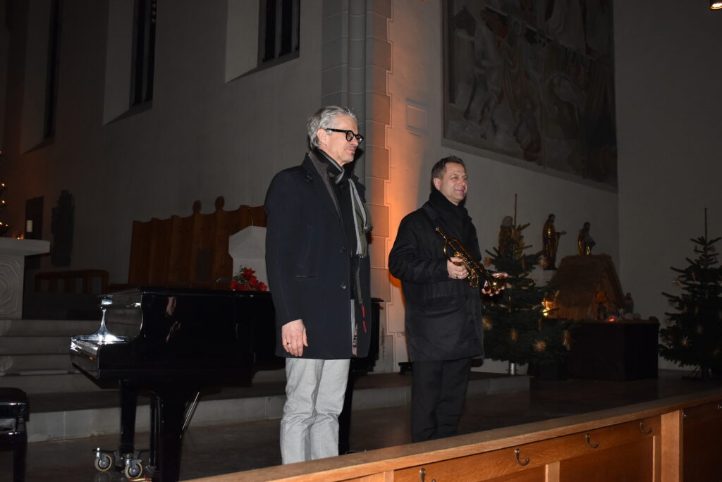 Begleitet von stehendem Applaus kamen die beiden Musikkünstler nach vorne und freuten sich sehr über den langen Beifall. Franz Günthner dankte seinem Freund und Kollegen Hans Jürgen Huber, der wieder einmal alle begeisterte. Als kleine Zugabe, und weil die Stimmung in der Kirche so friedlich und weihnachtlich war, sangen alle zusammen „Stille Nacht“, begleitet von Günthner am Flügel vorne und Huber an einer leisen Trompete. Erfüllt von festlicher Musik und traumhafter Stimmung ging es hinaus in die Silvester-, bzw. Neujahrsnacht.