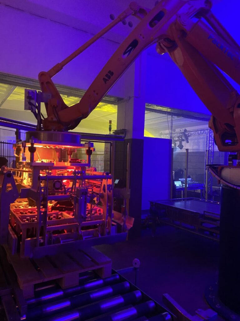 Neben der Bühne arbeitete in dieser Nacht der automatisch arbeitende Kommissionier-Roboter. Im Maschinen-Takt hievte er bunt beleuchtet Getränke-Kästen auf Paletten (Bild). Moderne Zeiten 2024 im alt-ehrwürdigen Brau-Tempel von 1897. Bewährte Vergangenheit und wirtschaftliche Zukunft.