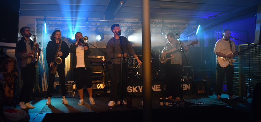 Und es gab ordentlich was auf die Ohren. „Alles dreht sich” sang die Nürnberger Gruppe “Skyline Green” (Bild) in einem der Säle im Brauhaus. Sie brachte dabei allerhand Rohre zum Tönen – geblasen von Saxophonistin Anne Brand. Mal schmetterte die fest-freudige Franken-Combo schnell tanzbare Blasmusik wie auf einer Balkan-Party. Mal erklang hitzig Latin-Rock. Mal kamen ihre Lieder im Ska – also irgendwo zwischen Reggae für Holzfäller und Tango für Transportarbeiter. Das Publikum im dicht gedrängt nebligen Saal spendete heftig Applaus.
