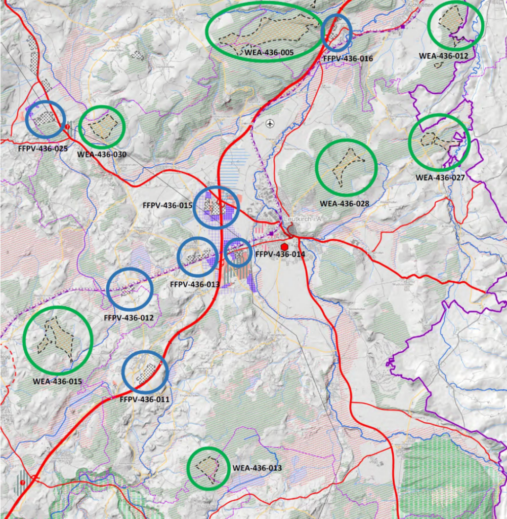 Vorranggebiete Windenergie (grün) und Vorbehaltsgebiete Photovoltaik (blau) im Bereich Leutkirch. Violett sind die Landes- und Gemeindegrenzen eingezeichnet. Die Karte wurde der auf der Webseite der Stadt veröffentlichten Sitzungsvorlage entnommen. WEA = Windenergieanlage; 436-030: Diepoldshofer Wald; 436-015: Kißlegg Ost-1; 436-013: bei Enkenhofen: 436-028: Stadtwald; 436-027: Illerwinkel; 436-012: Aichstetten-Ost; 436-005: Altmannshofen.