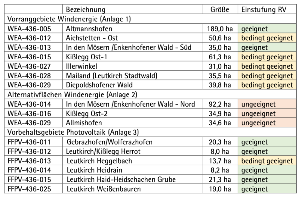 Auf Leutkircher Gemeindegebiet sollen laut Sitzungsvorlage (abgeleitet vom Entwurf des Regionalplanes, so beschlossen von der Regionalverbandsversammlung im Dezember 2023; ist noch nicht rechtskräftig) ca. 150 Hektar als Vorranggebiet für die Windkraft ausgewiesen werden. Das sind etwa 0,85 % der gesamten Gemeindefläche.