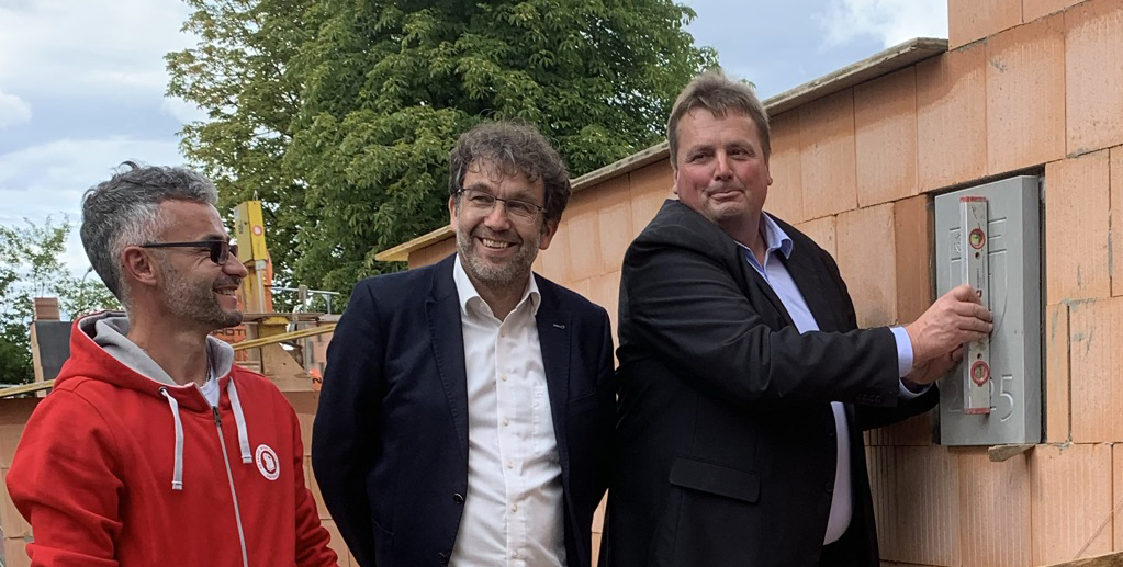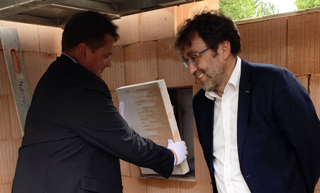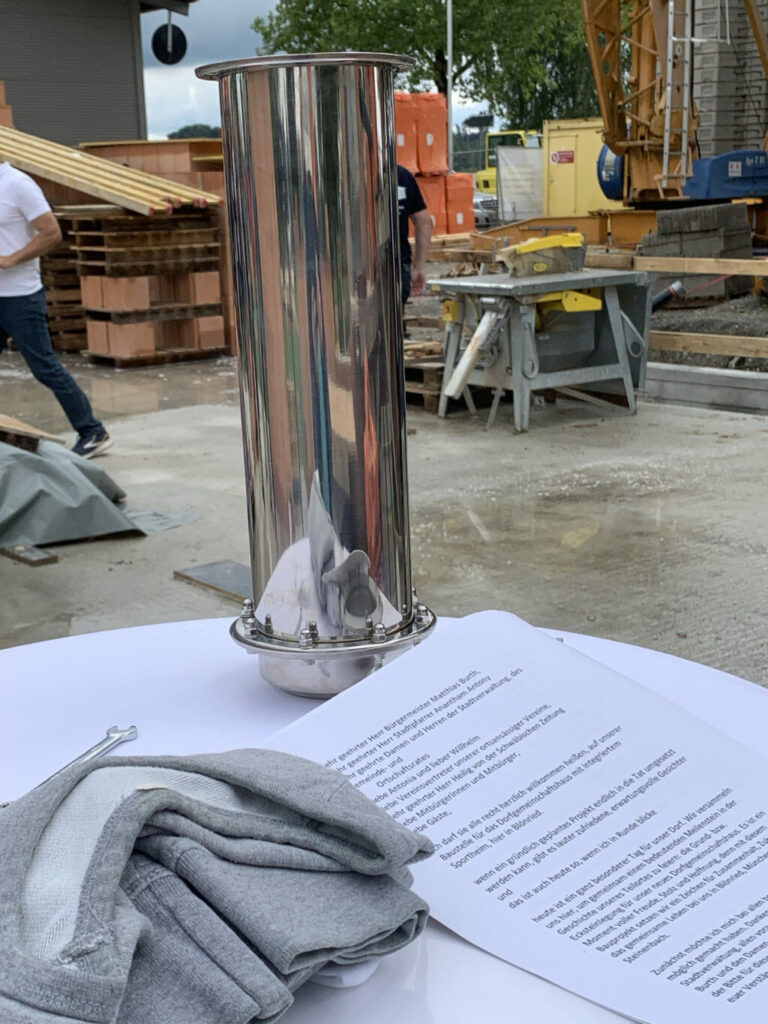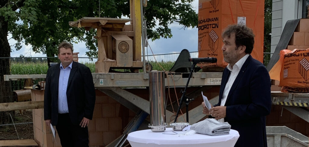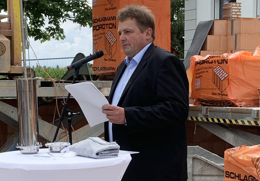 Blönried – Sogar das Wetter spielte mit am vergangenen Freitag! Dunkle Regenwolken wichen rechtzeitig der Juli-Sonne, als man sich in Blönried zur feierlichen Grundsteinlegung des künftigen Dorfgemeinschaftshauses mit Sportheim im Feuerwehrhaus einfand (25.7.). So konnte die heitere Feier planmäßig unter freiem Himmel auf der Baustelle stattfinden. Neben Bürgermeister Matthias Burth und Ortsvorsteher Bernhard Metzler ergriffen auch Metzlers Vorgänger Hartmut Holder und Christoph Metzler vom SC Blönried das Wort.