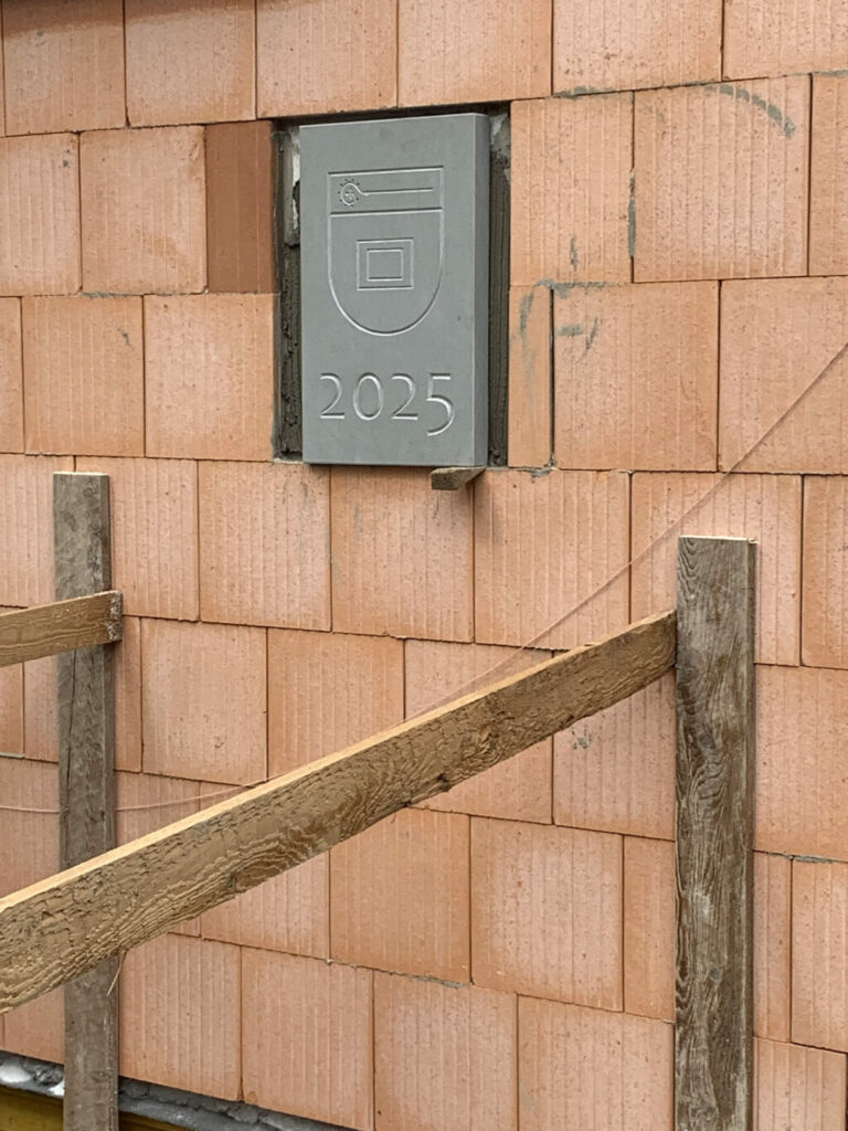 Die Abschlussplatte liegt bereit. Sie trägt das Wappen Blönrieds und die Jahreszahl der Grundsteinlegung.
