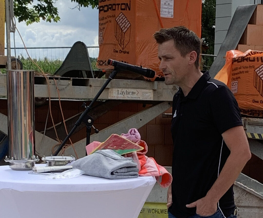 Bürgermeister Matthias Burth begann mit der Feststellung, man habe selbst in der Hand, was aus uns werde. Die Blönrieder schafften sich nun ihre Dorfmitte, wo Kindergarten, Sport, Feuerwehr und auch das Maibaumstellen zusammen sein werde. Er erinnerte an die Zeiten, als die Feuerwehr völlig unzulänglich in einer Garage am Rathaus untergebracht war und das neue Fahrzeug dort nicht mehr reinpasste. Es gebe nun zentral Räume für Bürger, für Treffen örtlicher Vereine bis hin zum Narrenverein „Stoinabacher Bobbele“. Alle hätten darauf hingearbeitet und die Ortschaft werde nun weiter geprägt durch dieses Projekt. Burth dankte der Verwaltung, die mit diesem Vorhaben intensiv beschäftigt war, insbesondere Herrn Schilling, er dankte Gemeinderat und Ortschaftsrat, die alle von Anfang an hinter dem Vorhaben standen, er dankte dem SC Blönried für Geduld und Verständnis und auch dafür, dass man nicht nur forderte, sondern sich auch selbst einbrachte, unter anderem bei der Finanzierung, er dankte dem Planungsbüro Kasten und dem von der katholischen Kirchengemeinde getragenen Kindergarten und dazu auch Stadtpfarrer Anantham Antony sowie den Anwohnern für deren Verständnis während der Baumaßnahmen und schließlich auch der ausführenden Baufirma Wohlwender aus Fleischwangen. Er freue sich auf die Grundsteinlegung und wünschte eine unfallfreie Vollendung des Projekts.