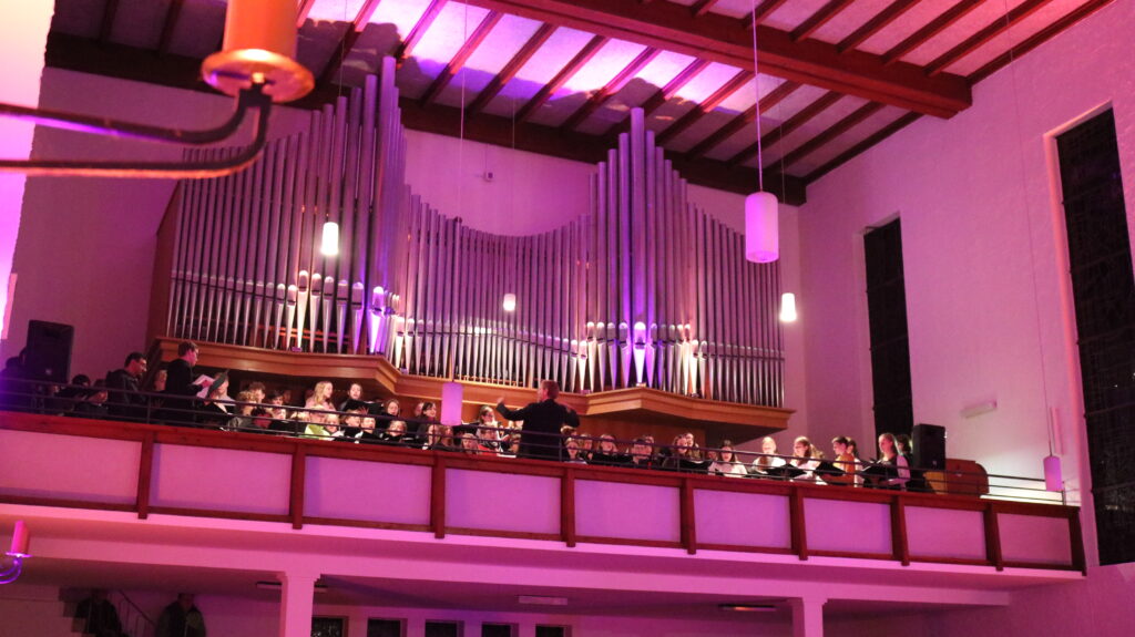 Den Ortswechsel des Chors von der Empore in den Altarraum überspielten Orgel und ein Trompetenduo mit dem fulminanten „Marche Triomphale – Nun danket alle Gott“, welcher den von Frau Schmid vorgetragenen Text „Ich will den rauschenden Klang der Orgel hören“ für alle unüberhörbar zum Ausdruck brachte.