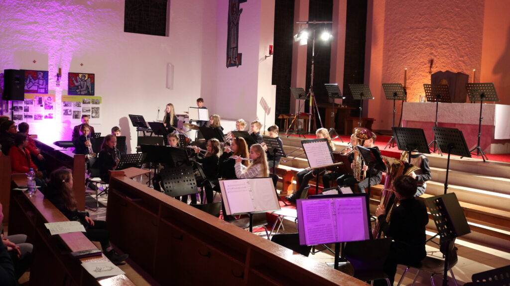 Selbst die Jüngsten von der Bläserklasse konnten bereits nach nur acht Wochen am Instrument mehrere Stücke zu Gehör bringen, dass es eine Freude war. Auch die Unterstufenband der Klassen 5 und 6 zeigten mit „Feliz Navidad“, welch große Fortschritte in kurzer Zeit möglich sind. Das Streicherensemble hatte da bereits mit einer Bläsergruppe für die feierliche Eröffnung des Abends gesorgt. Nun verkündete der Schulchor, der sich aus Unterstufenchor, Mittel- und Oberstufenchor, den Musikkursen sowie einigen Lehrerinnen und Lehrern zusammensetzt, von der Empore aus, dass er bereit für den Abend war: „I will sing“ ließ den Zauber der Adventszeit erklingen.