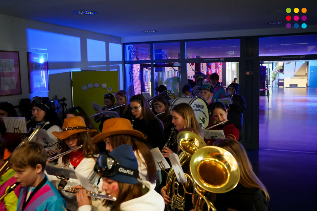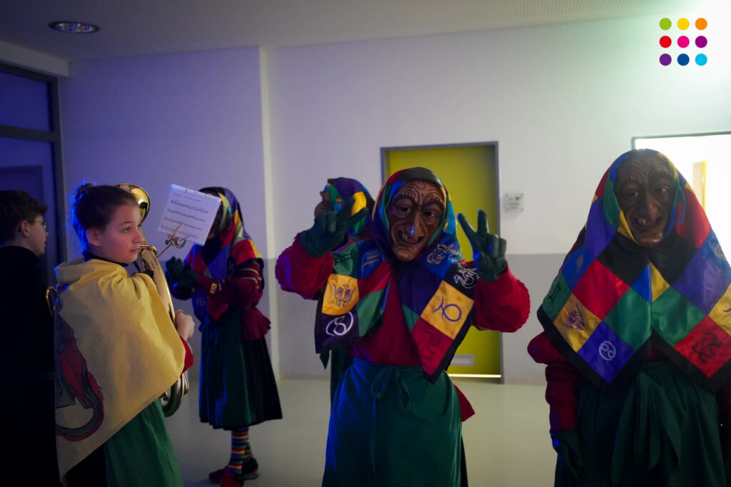 Zum Programm gehörte ein Liederquiz, bei dem 5 Lehrkräfte als „menschliche Buzzer“ agieren mussten. Manche Schülerinnen und Schüler nahmen das Quiz äußerst ernst, sodass mancher Lehrer vermutlich mit leichten Kopfschmerzen in die wohlverdienten Fasnetsferien entlassen wird. Anschließend wurden die Schülerinnen und Schüler von Moderatorin Laura Sackmann grandios angeheizt, sodass keine Langeweile aufkam. In diesem Jahr besonders war eine Performance der Sprunghexen der Narrenzunft, die mit ihren akrobatischen Kunststücken für große Unterhaltung sorgten.