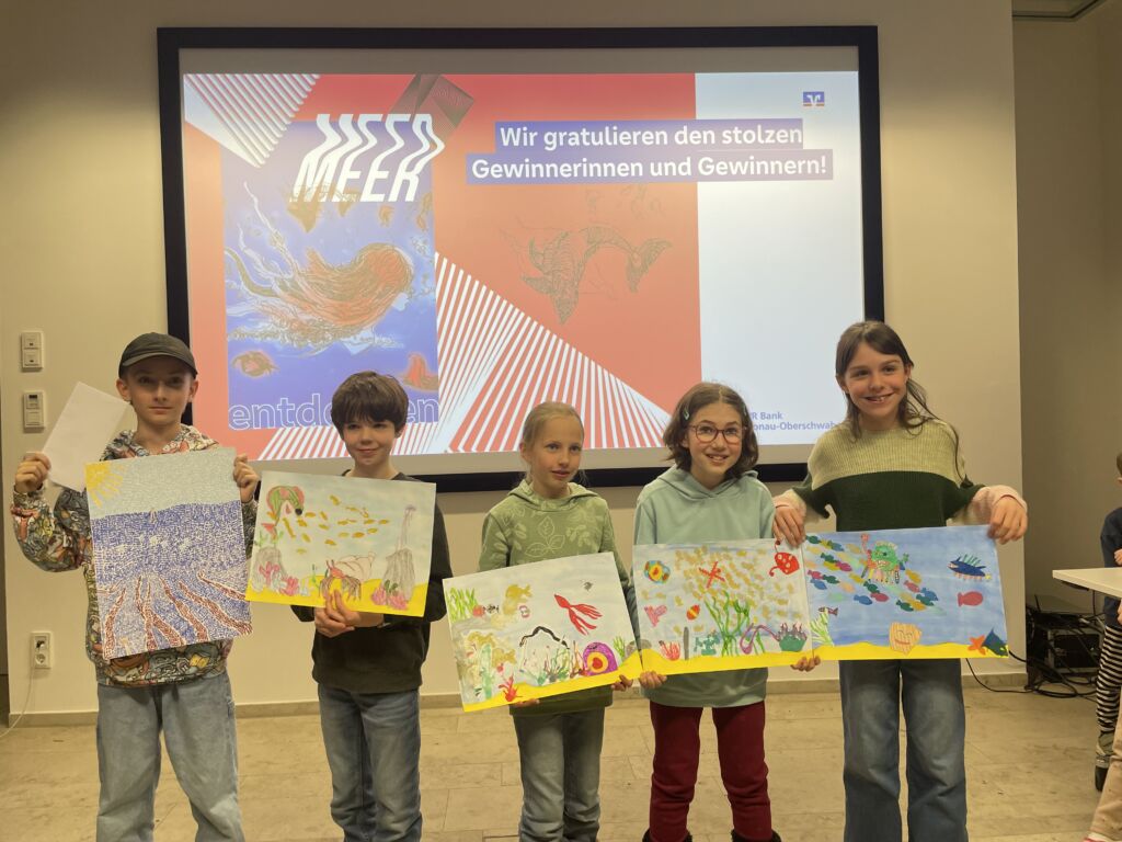 Wir gratulieren Jonas Frick, Kl. 5, zum 2. Platz und Franziska Wirbel zum 3. Platz in der Kategorie der Klasse 5/6, Anerkennungspreise gab es für Nora Brombeis und Johanna Straßer (ebenfalls Kl. 5). Anerkennungspreise erhielten auch Max Emele, Santiago Juanes, und Ysnije Krasniqi (alle Kl. 7). Wir gratulieren! In der Schalterhalle der Volksbank in Bad Saulgau, aber auch Aulendorf, werden die Bilder bis 30. April digital auf den Monitoren zu sehen sein. Vielen Dank hier auch an Frau Hugger, die uns betreute und Sachpreise für alle mitbrachte, die teilgenommen hatten.