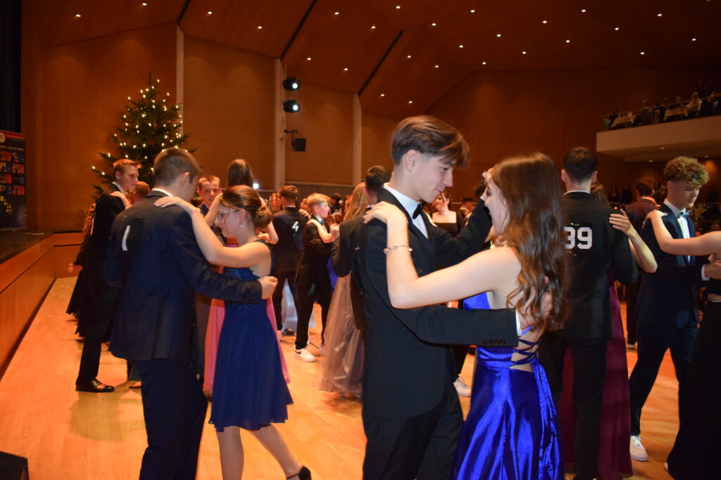 Blönried – Das diesjährige „Tanzkränzle“ der Zehntklässler des Studienkollegs St. Johann Blönried hat am Freitag, 1. Dezember, im Kultur-und Kongresszentrum in Weingarten stattgefunden. Dem Motto „Winternachtsball“ wurde der Abend in jeder Hinsicht gerecht. Draußen funkelte der Schnee und drinnen glänzte der Saal mit seinem großen Weihnachtsbaum. Nicht weniger festlich waren die Stimmung und die eleganten Ballkleider der Tänzerinnen.
