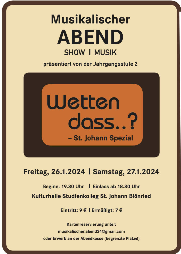 Blönried – Die Abiturientinnen und Abiturienten des Studienkollegs Blönried führen am 26. und 27. Januar einen musikalischen Abend unter dem Motto „Wetten dass“ auf – jeweils um 19.30 Uhr in der Kulturhalle (Einlass ab 18.30 Uhr).