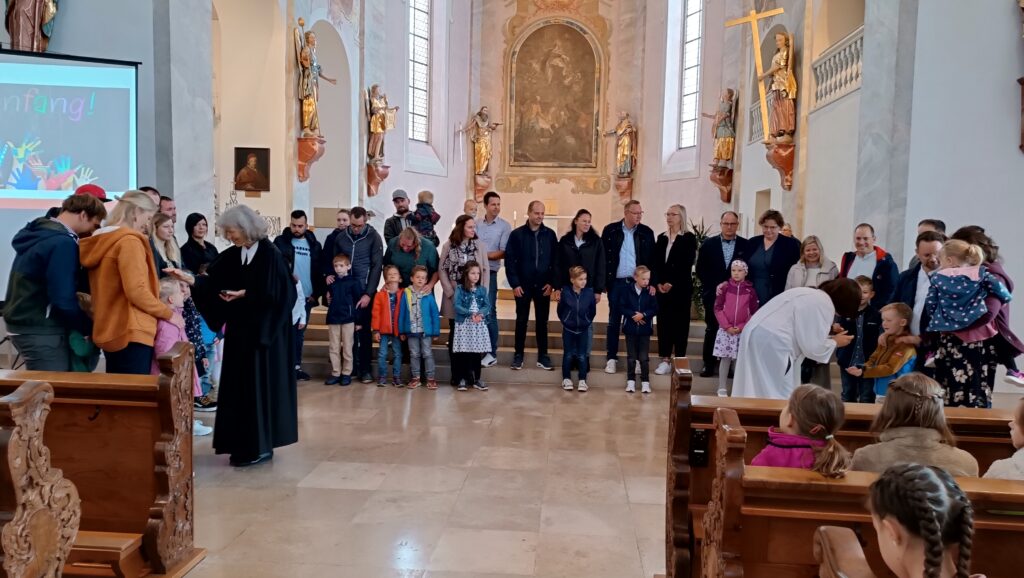Reute – „Einfach Spitze, dass Du da bist“, mit diesem Lied begann der ökumenische Wortgottesdienst zur Einschulung in der Pfarr- und Wallfahrtskirche St. Peter und Paul in Reute. Pfarrerin Birgit Oehme und Gemeindereferentin Kathrin Bohnenberger freuten sich über den sehr zahlreichen Besuch dieser kirchlichen Feier. „So voll ist die große Kirche in Reute selten, ich begrüße neben den Erstklässlern gerne auch alle Eltern und Großeltern, Geschwister und Freunde der Familien“, so Birgit Oehme wertschätzend. Ihr Gruß galt auch Leo Straßner am Keyboard.