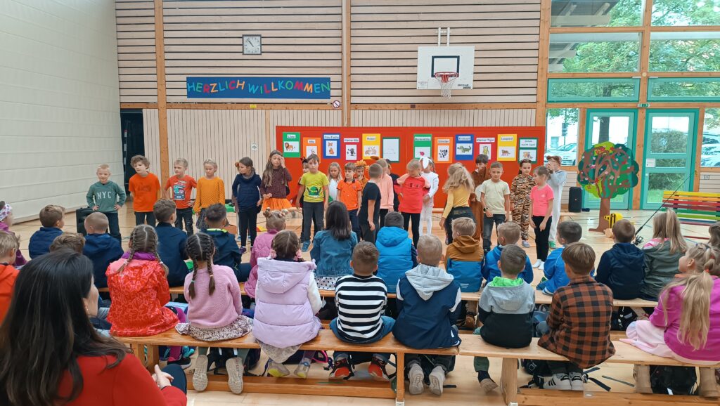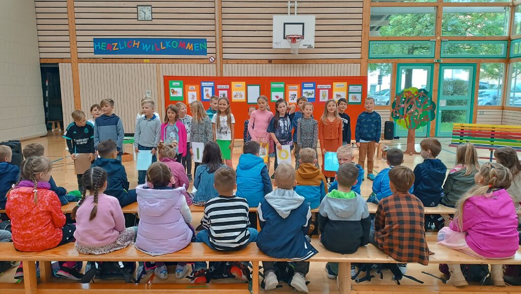 In der Durlesbachhalle eröffneten die Schüler der 3. Klasse (mit Konrektor Roland Schlachter) die Einschulungsfeier mit dem Lied „Alle Kinder lernen lesen“. Rektor Bernd Scharfenort freute sich, dass es dieses Jahr mit 35 Kindern wieder zwei Klassen gibt. So unterrichtet Gertrud Merk die Klasse 1 a, für die Klasse 1 b ist Anja Vogel verantwortlich. Scharfenort ging mit dem Mikrofon durch die Reihen der „Neuen“, jedes Kind durfte jetzt seinen Namen sagen. „Danke, jetzt wissen wir es genau, wer zu uns gekommen ist“, lobte der Rektor.