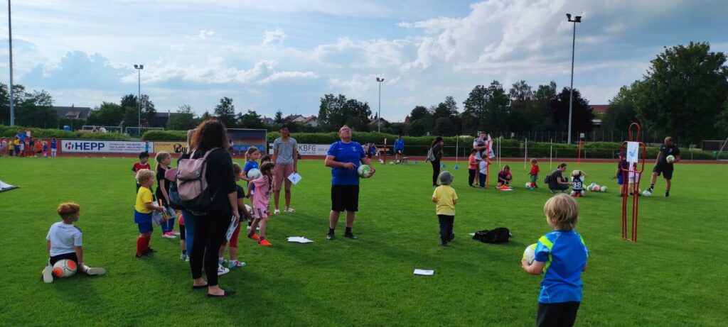 Jedes Kind konnte selbstständig mit dem EM-Heftchen des DFB die verschiedenen Stationen absolvieren, an denen sie ihre motorischen Fähigkeiten verbessern und erste Techniken erlernen konnten. Es gab Übungen zum Dribbeln, Passen und Schießen, die alle kindgerecht und spielerisch gestaltet waren. Die Trainer und Betreuer sorgten dafür, dass jedes Kind individuell gefördert wurde und Spaß an den Übungen hatte. Für die Kinder, die mit den Übungen schneller fertig waren, gab es auf dem F-Jugend- oder Bambini-Spielfeld die Möglichkeit, das Erlernte sofort umzusetzen.