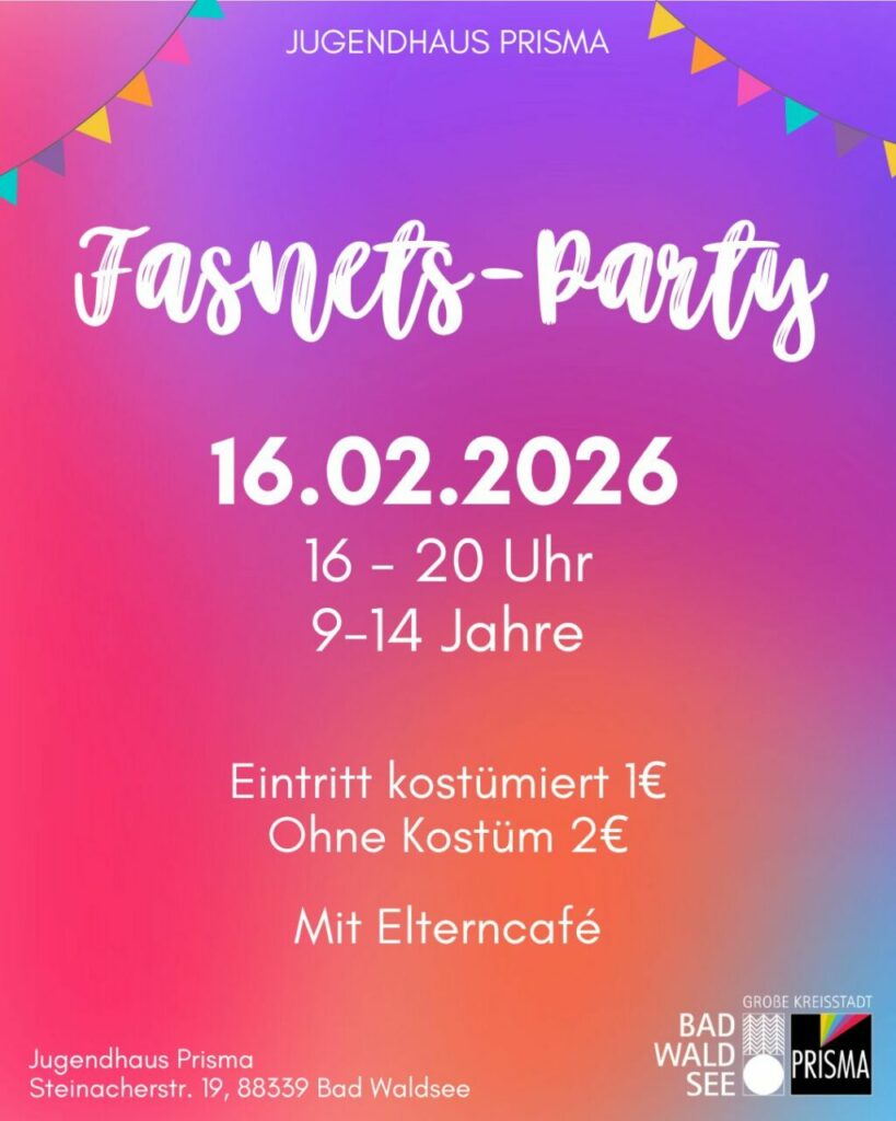 Am Fasnetsmontag veranstaltet das Jugendhaus Prisma eine Party für 9- bis 14-Jährige. Auch Eltern sind herzlich eingeladen, ihre Kinder zu begleiten oder sich mit anderen Eltern auszutauschen.