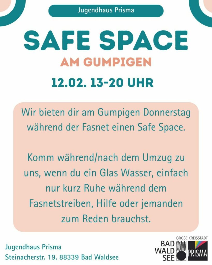 Am „Gumpigen Donnerstag“ richtet das Jugendhaus einen sicheren Raum ein, in dem alle, die Hilfe, Ruhe oder Unterstützung während und nach dem Umzug benötigen, willkommen sind. Zusätzlich wird Mona Scholl in der Stadt unterwegs sein und bei Bedarf direkt vor Ort unterstützen.