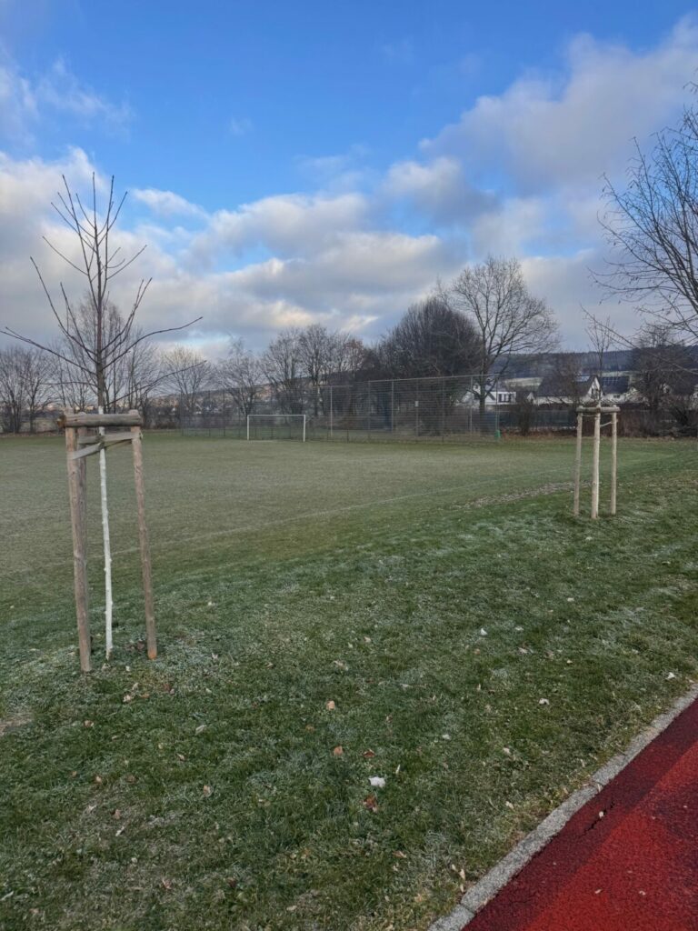 Im Zuge des Neubaus mussten fünf Bäume gefällt werden. Gemäß den eigenen Vorgaben der Stadt wurden diese durch eine 1:3-Bepflanzung ersetzt – das bedeutet, dass insgesamt 15 neue Bäume gepflanzt wurden. Die ersten fünf Bäume wurden zügig in direkter Nähe zum Bauvorhaben gesetzt, um die 1:1-Ersetzung schnellstmöglich umzusetzen. Für die freiwillige Verpflichtung der weiteren zehn Bäume hat die Stadt nun in der unmittelbaren Umgebung – entlang des Sport- und Tennisplatzes – zusätzliche Bäume gepflanzt. Mit dieser Maßnahme ist die vollständige Ausgleichsbepflanzung erfolgreich abgeschlossen. Oberbürgermeister Matthias Henne zeigte sich erfreut über den Abschluss der Arbeiten, die nicht nur der Umwelt zugutekommen, sondern auch das Umfeld des Kindergartens und der Sportanlagen weiter aufwerten.