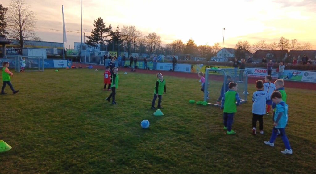 Voller Freude und Elan stürzten sich die knapp 30 Kinder auf die Bälle. Spielfeld, Passübungen sowie ein bisschen Kraft- und Konditionstraining hatten sich die Übungsleiter Ronja, Bo, Dani und Chris überlegt. Nach einer Stunde war es dann auch schon vorbei.