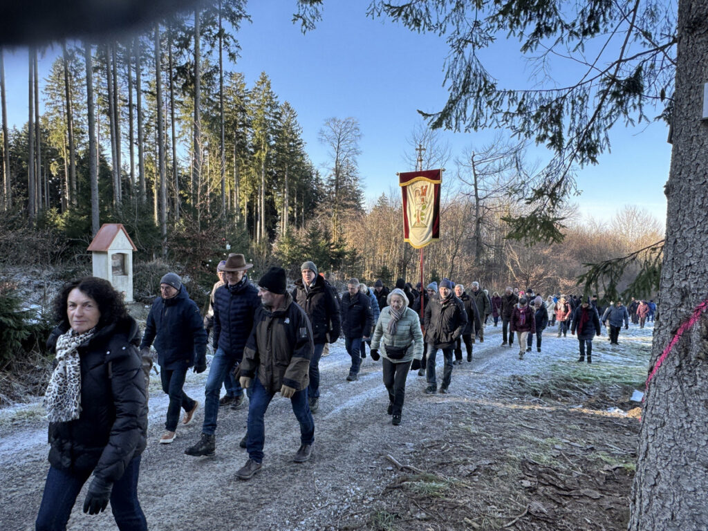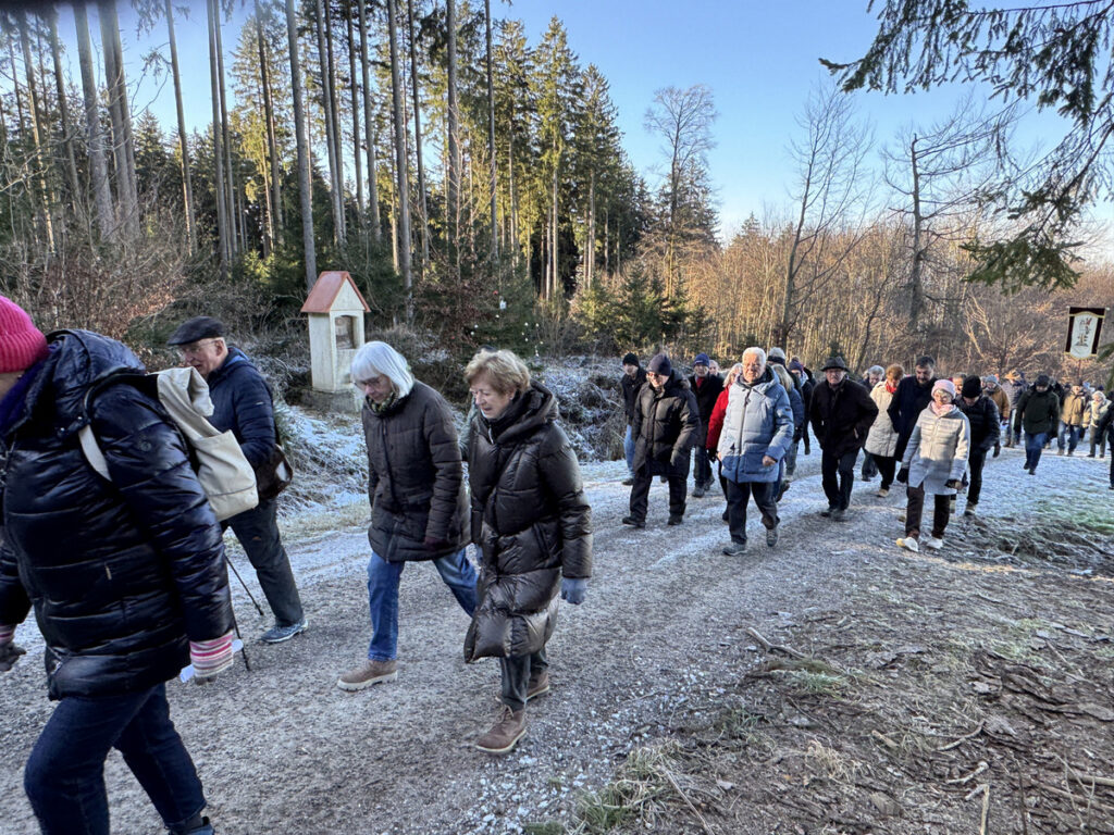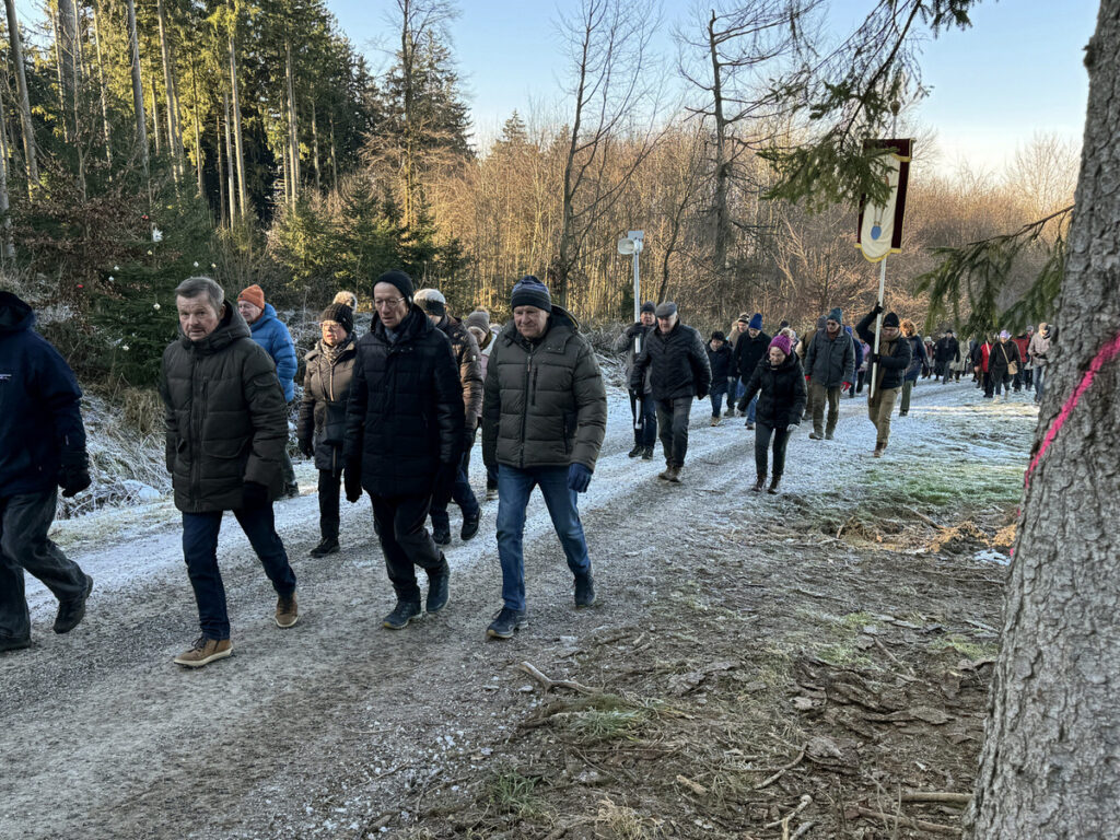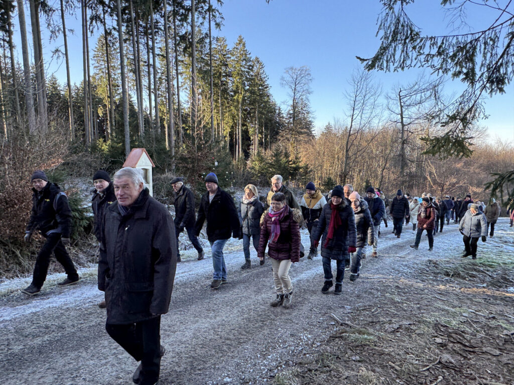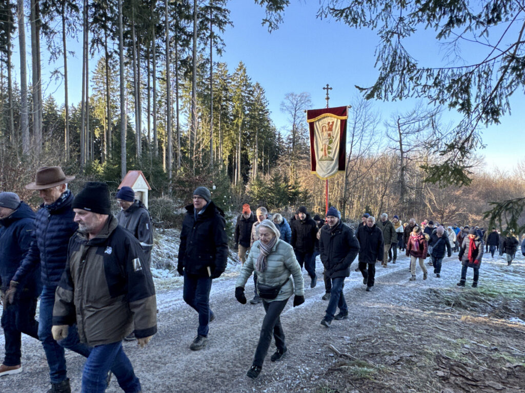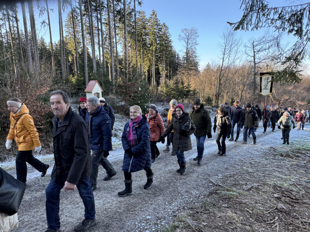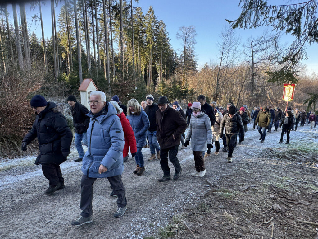 Als sich die große Pilgerschar nach der Festmesse betend und singend hinauf zur Sebastianskapelle auf den Weg machte, herrschte eitel Sonnenschein bei Temperaturen knapp unter 0 Grad.. Der stete Anstieg ist durchaus beschwerlich, aber auffallend viele ältere Menschen meisterten diese Herausforderung ganz gut, darunter auch der 94-jährige Hermann Kemmler. „Die Wallfahrt ist für mich Pflicht“, meinte der treue Mitpilgernde. Die Wegstrecke war mit Kies rechtzeitig bestreut worden, da sich der Schneebelag im Waldbereich doch teilweise in Eis verwandelt hatte. Oben erstrahlte die Kapelle im hellem Sonnenlicht unter blauem Himmel, umgeben vom prachtvollen winterlichen Fichtenwald.