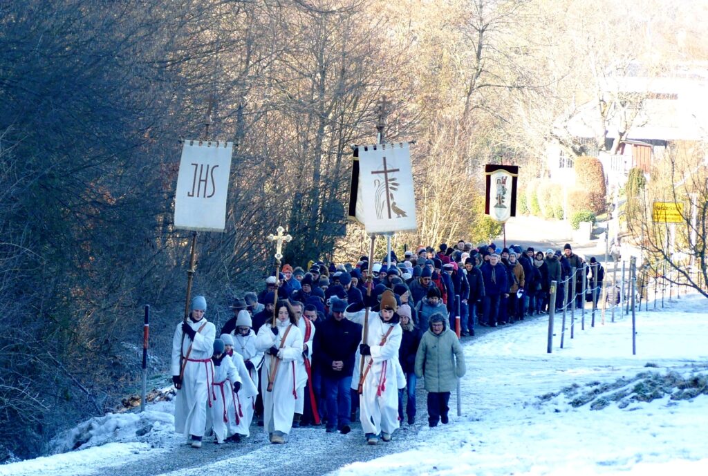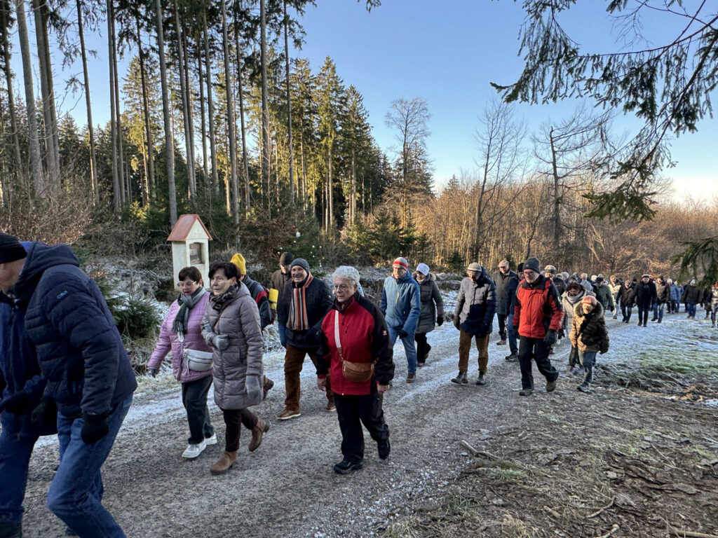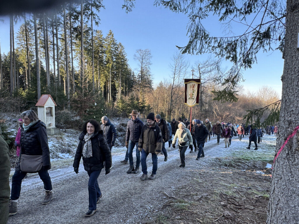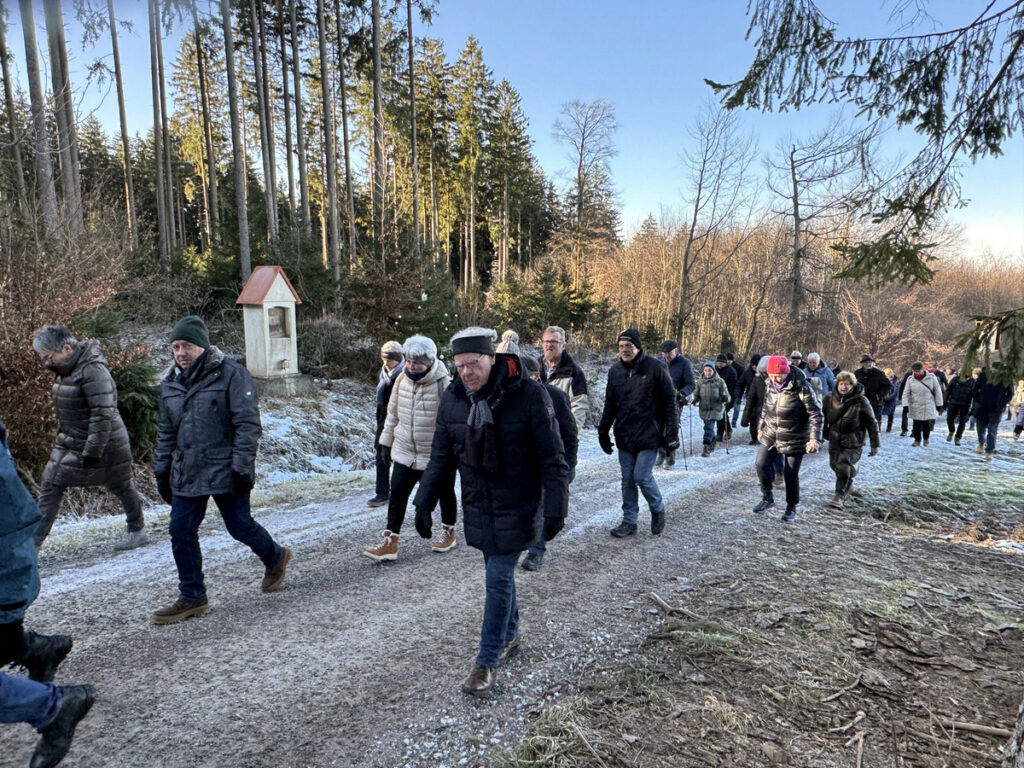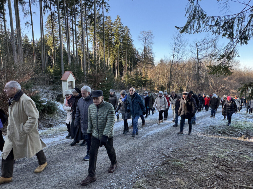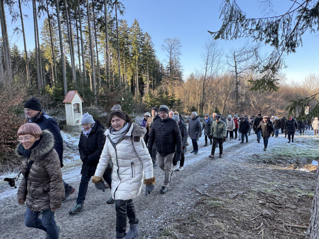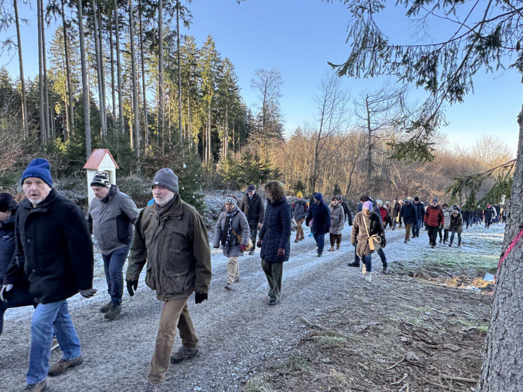 Als sich die große Pilgerschar nach der Festmesse betend und singend hinauf zur Sebastianskapelle auf den Weg machte, herrschte eitel Sonnenschein bei Temperaturen knapp unter 0 Grad.. Der stete Anstieg ist durchaus beschwerlich, aber auffallend viele ältere Menschen meisterten diese Herausforderung ganz gut, darunter auch der 94-jährige Hermann Kemmler. „Die Wallfahrt ist für mich Pflicht“, meinte der treue Mitpilgernde. Die Wegstrecke war mit Kies rechtzeitig bestreut worden, da sich der Schneebelag im Waldbereich doch teilweise in Eis verwandelt hatte. Oben erstrahlte die Kapelle im hellem Sonnenlicht unter blauem Himmel, umgeben vom prachtvollen winterlichen Fichtenwald.
