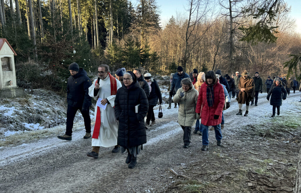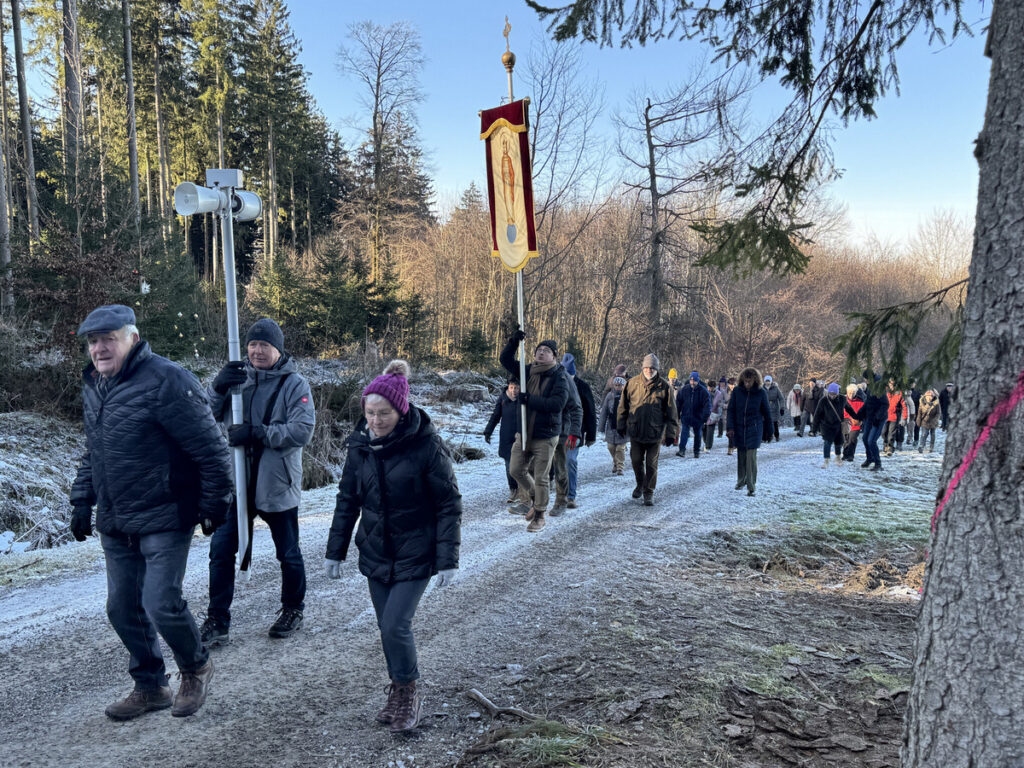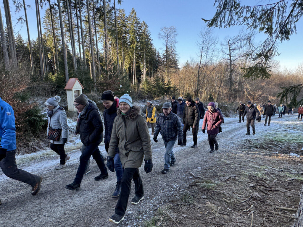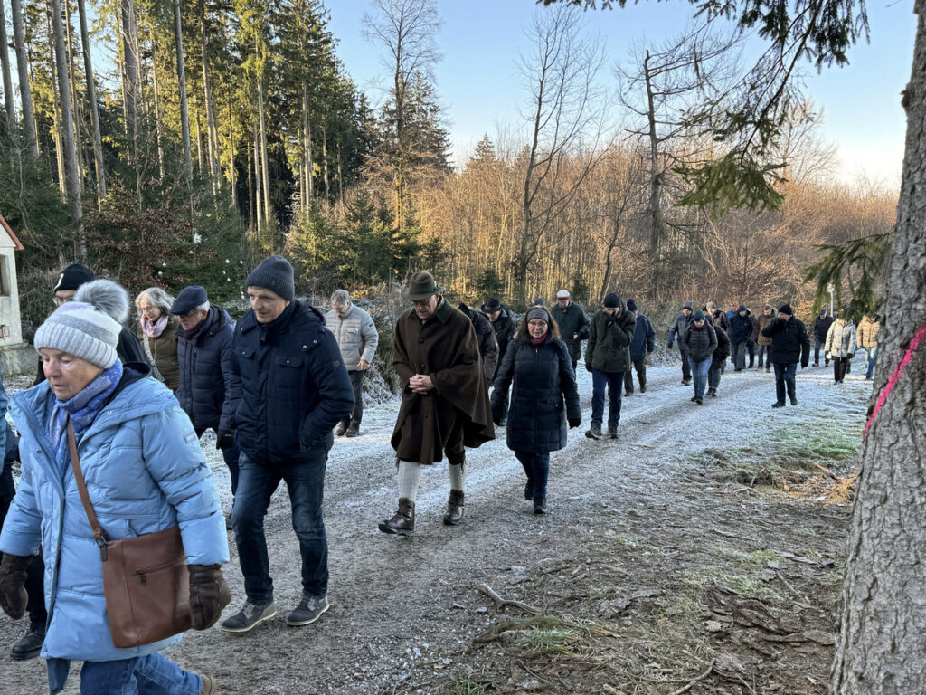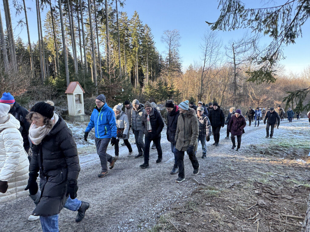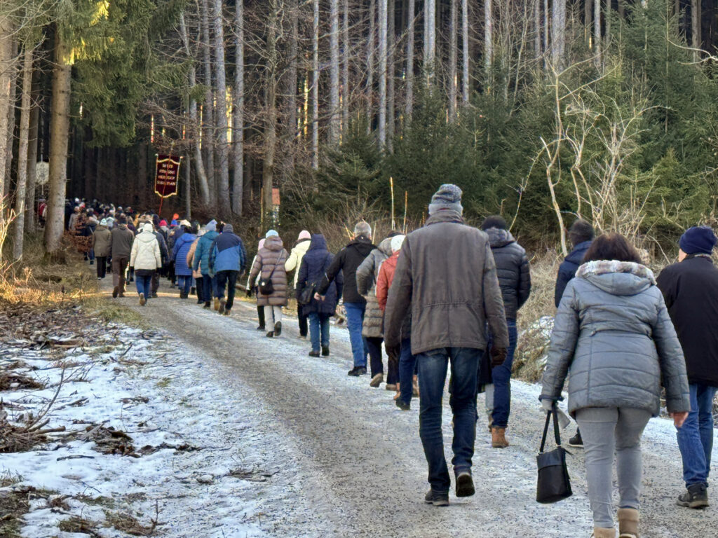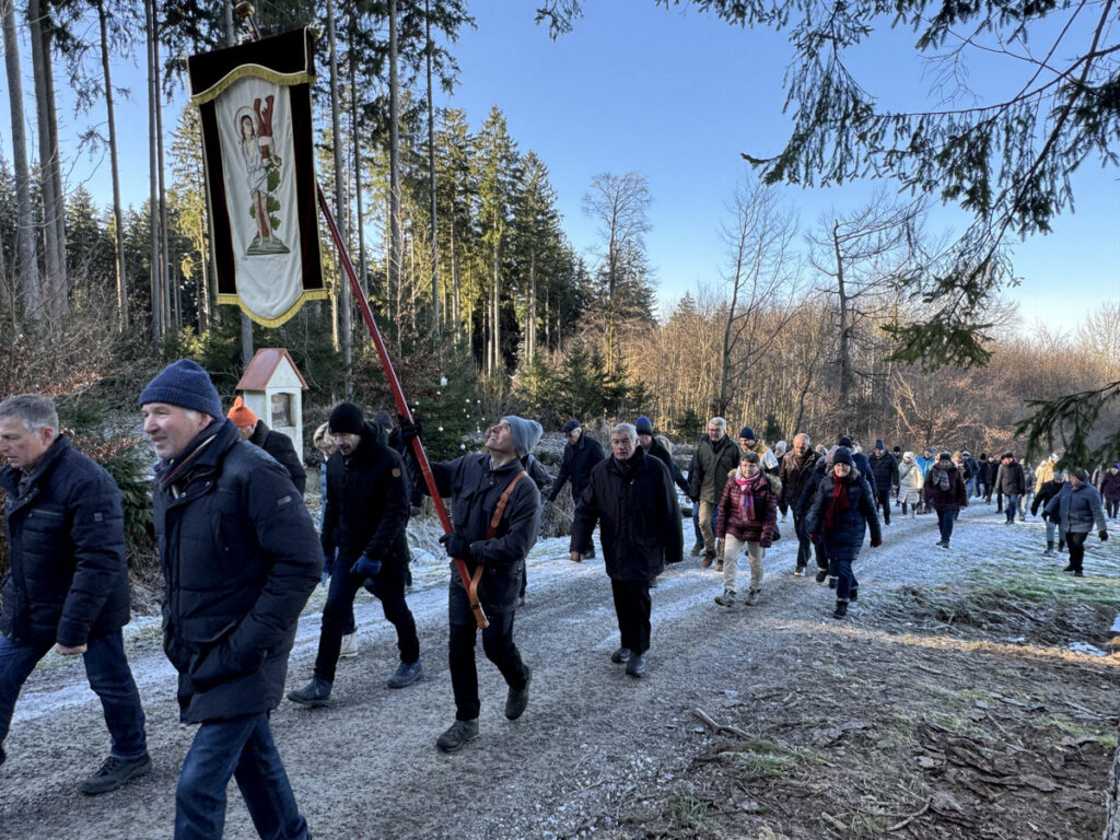 Als sich die große Pilgerschar nach der Festmesse betend und singend hinauf zur Sebastianskapelle auf den Weg machte, herrschte eitel Sonnenschein bei Temperaturen knapp unter 0 Grad.. Der stete Anstieg ist durchaus beschwerlich, aber auffallend viele ältere Menschen meisterten diese Herausforderung ganz gut, darunter auch der 94-jährige Hermann Kemmler. „Die Wallfahrt ist für mich Pflicht“, meinte der treue Mitpilgernde. Die Wegstrecke war mit Kies rechtzeitig bestreut worden, da sich der Schneebelag im Waldbereich doch teilweise in Eis verwandelt hatte. Oben erstrahlte die Kapelle im hellem Sonnenlicht unter blauem Himmel, umgeben vom prachtvollen winterlichen Fichtenwald.