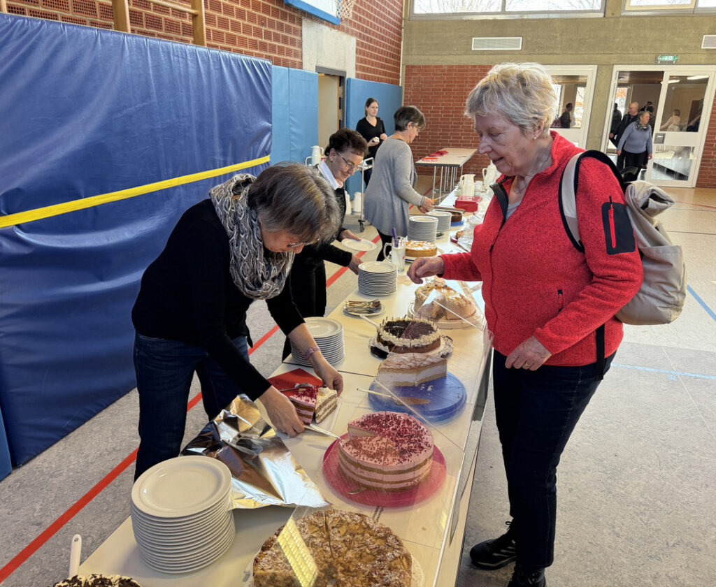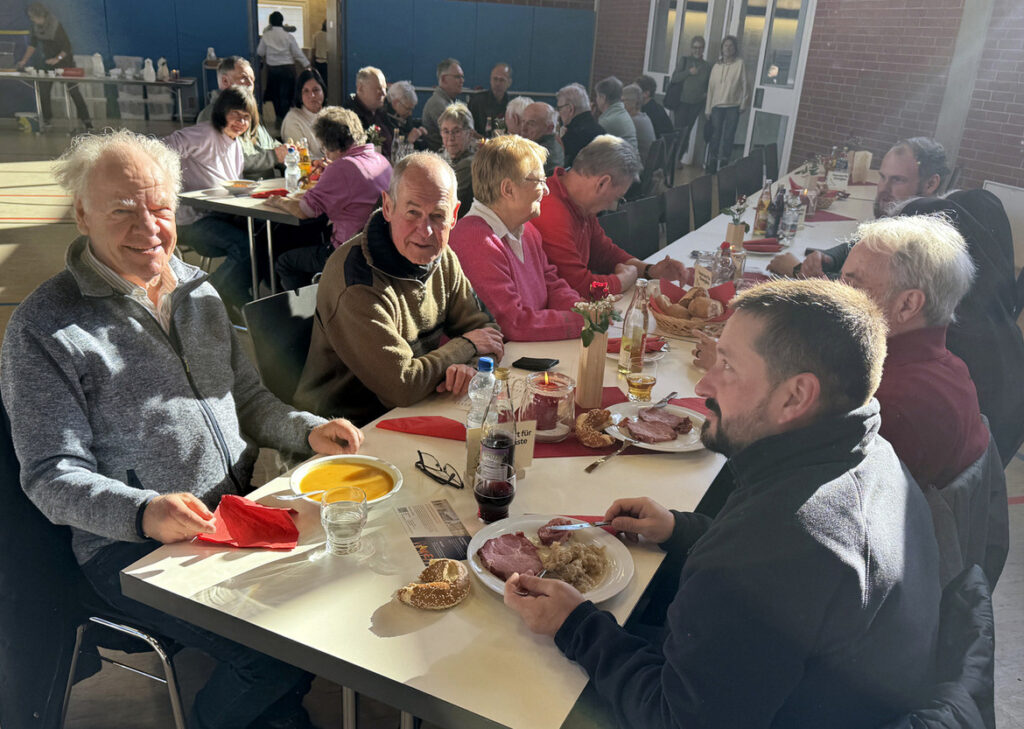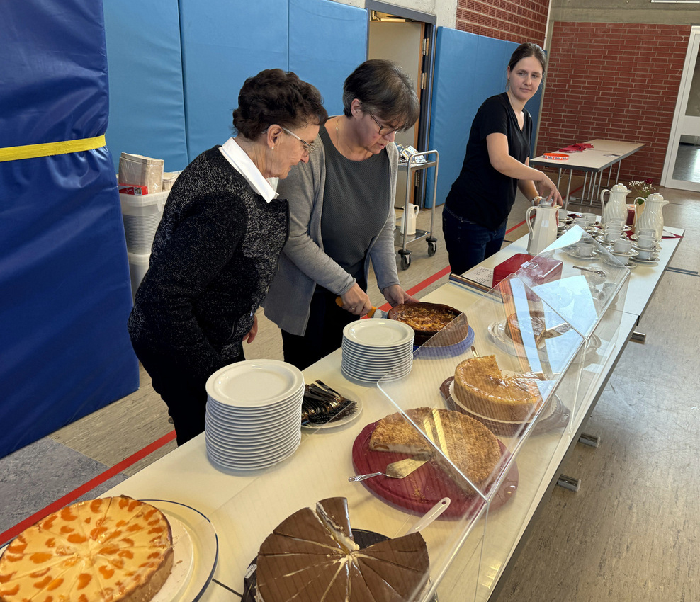 Streng hatten es die Mitglieder des Kirchengemeinderats und ehrenamtliche Helferinnen und Helfer – viele davon mussten sich ja auch einen Urlaubstag nehmen – denn sie hatten ganztägig dafür Sorge getragen, dass sich die Pilger in der Gemeindehalle mit Speisen und Getränken sowie Kaffee und gespendeten Torten und Kuchen stärken konnten. Das Serviceteam im Küchenbereich wie im Saal schaffte es zur Mittagszeit, als alle Stühle belegt waren, die etwa 250 Essensgäste rasch und freundlichst zu bewirten.