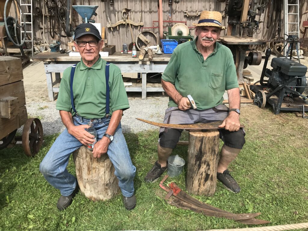 Josef Kessler (li.) und Philipp Kienle beim Sensen und Dengeln. Archivbild: Oldtimerfreunde Michelwinnaden