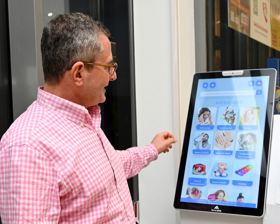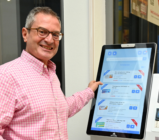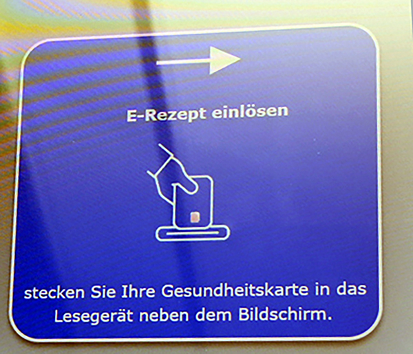 Gleich im Eingangsbereich steht die digitale Filiale der Beckerschen. Ein recht schmaler, unscheinbarer Apparat, der es in sich hat. In bequemer Lese- und Aktionshöhe befindet sich ein interaktives Touchpad (Tastfeld) und fordert den Benutzer auf, mal drauf zu tippen, um zu starten. Nach dem Start bietet das Terminal zwei Möglichkeiten zur Auswahl: entweder ein E-Rezept von seiner Krankenkassenkarte einzulösen oder freie Medikamente zu kaufen.
