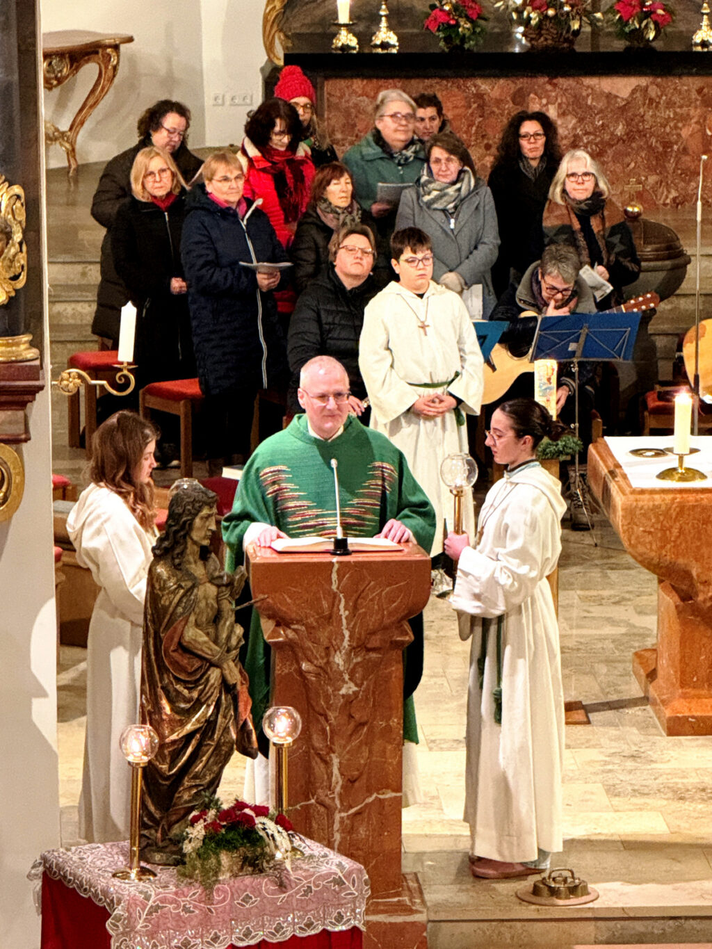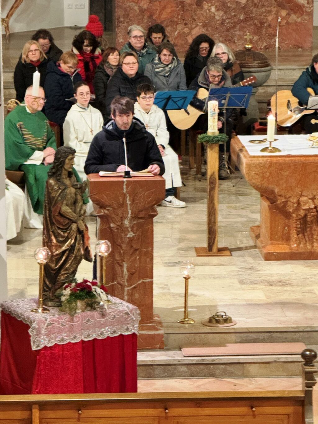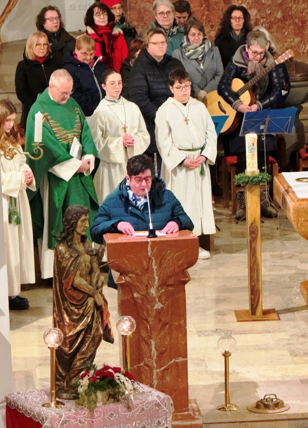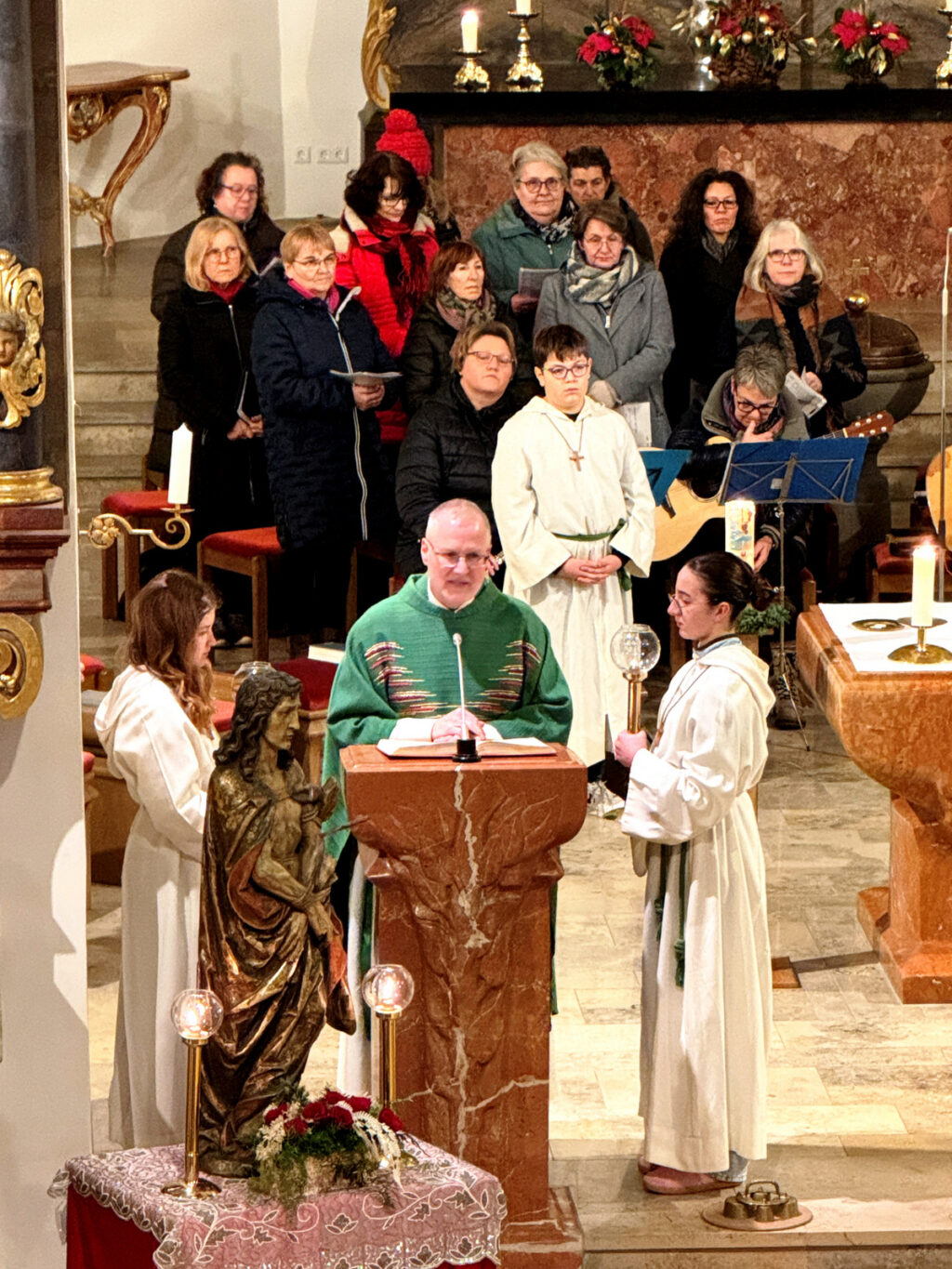 In seiner Predigt verstand es Pfarrer Stefan Maier, die Gläubigen durch seine Deutung des Lukasevangeliums (1,1-4; 4,14-21) mit klaren Worten überzeugend zu informieren. Der Bezug auf den Auftritt von Jesus in der Synagoge von Nazareth wurde verständlich und anschaulich dargestellt. Vertieft wurde so, wie Jesus den Armen frohe Botschaft bringt, Gefangenen die Entlassung verkündet, Blinden wieder zum Sehen verhilft und Zerschlagene in Freiheit setzt. So wurde ganz deutlich erkennbar, dass der Heiland für uns alle Heil gebracht hat und bringt. Der anhaltend große Beifall am Schluss der Eucharistiefeier galt dem Instrumental- und Singkreis, natürlich auch dem Zelebranten selbst, dem Vorbereitungsteam wie auch den Minis und Lektoren.