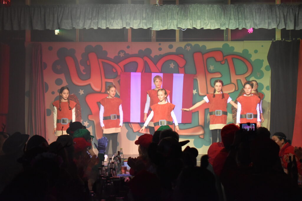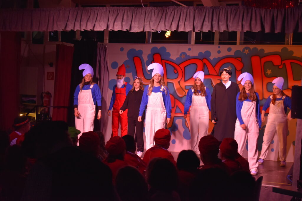 Im Anschluss hielten Monika Kling und Armin Notz ihr Klassentreffen auf der Bühne ab. Die zwei schwelgten in Erinnerungen aus Poesiealben und sorgten für unzählige Lacher beim Publikum. Dann brachte die Tanzgruppe „The Kings Valley Dancers“ aus Mittelurbach den Saal zum Beben. Die Gruppe, unter der Leitung von Magdalena Bohner und Manuel Konrad, tanzte gekonnt im Stil der Schlümpfe und der TV-Serie Phineas und Ferb. Dabei standen als Tänzer neben den beiden Leitern auf der Bühne: Alina Nold, Marco Nold, Theresa Bucher, Natalie Schröer, Julia Altvater und Sina Altvater.