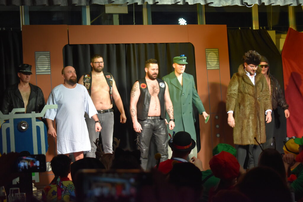 Darauf folgte echter Königstäler Kult: Die „Primelgässler“ Lydia Bosch, Klara Dürr und Gertrud Altvater nahmen die Gäste mit auf eine Reise durch die Fußballwelt. Das Publikum musste fast ununterbrochen lachen. Den Abschluss machte die Männertanzgruppe unter der Leitung von Evelyn Steiner, welche bekannte Fernsehprogramme wie Heidi oder Biene Maja vertanzten.