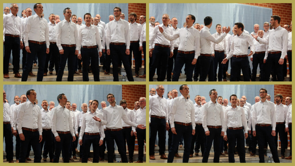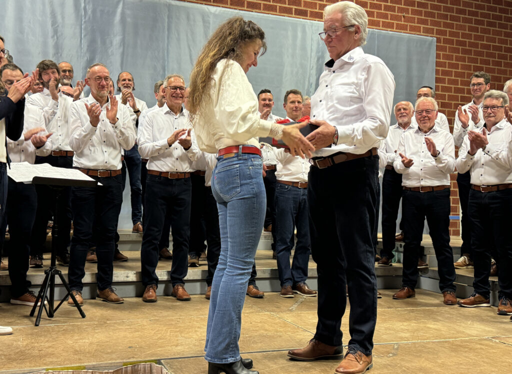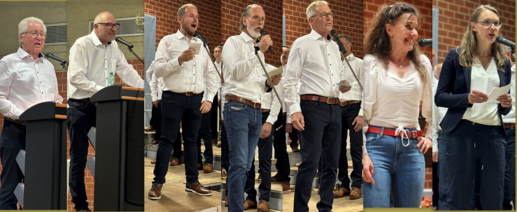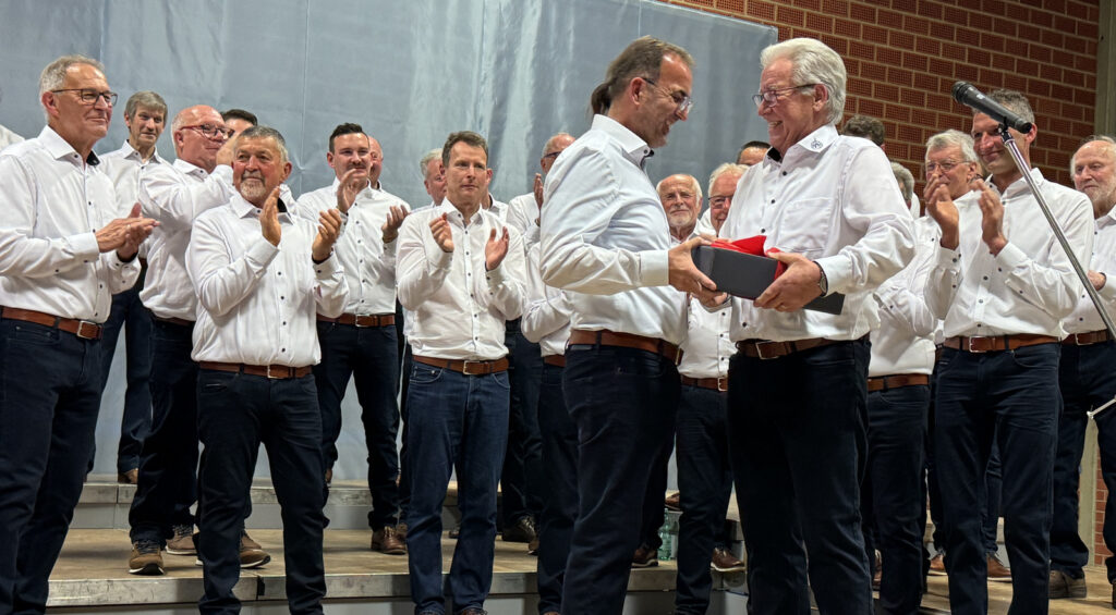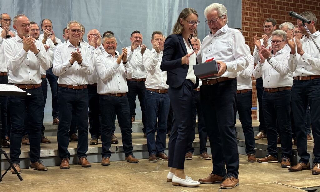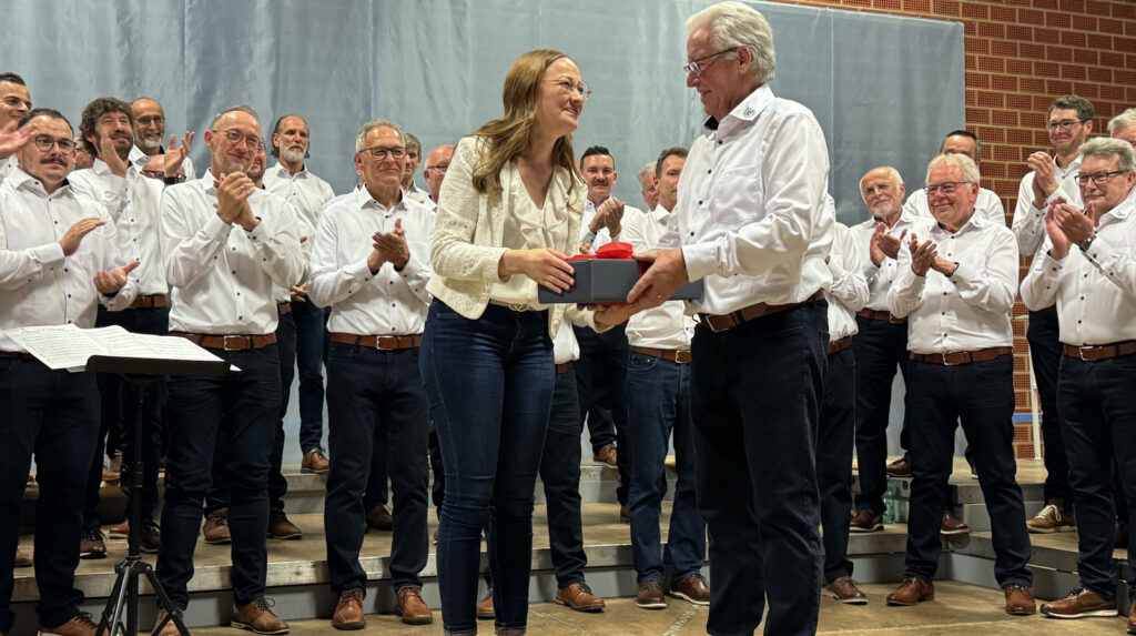Lang anhaltender Applaus war der beste Beweis, dass die gesamte Programmfolge hervorragend gelungen war. Werner Schach bedankte sich am Ende bei allen, die irgendwie zum hervorragenden Gelingen ihren Beitrag geliefert hatten (Saal-, Küchen-, Hausmeisterdienste). Dankespräsente überreichte er den beifallumrauschten Ulrike Marquart, Verena Westhäußer, Stefan Werner und Katrin Reichle. Bei Katrin Reichle schwoll der Beifall zur Höchstmarke des subjektiv empfundenen Lautstärkepegels an. Ähnlich hoch war dieser, als Matthias Covic das neue Outfit des Männerchors vorgestellt hatte.