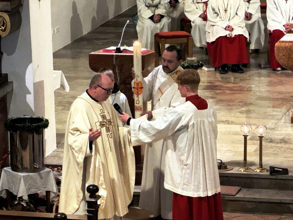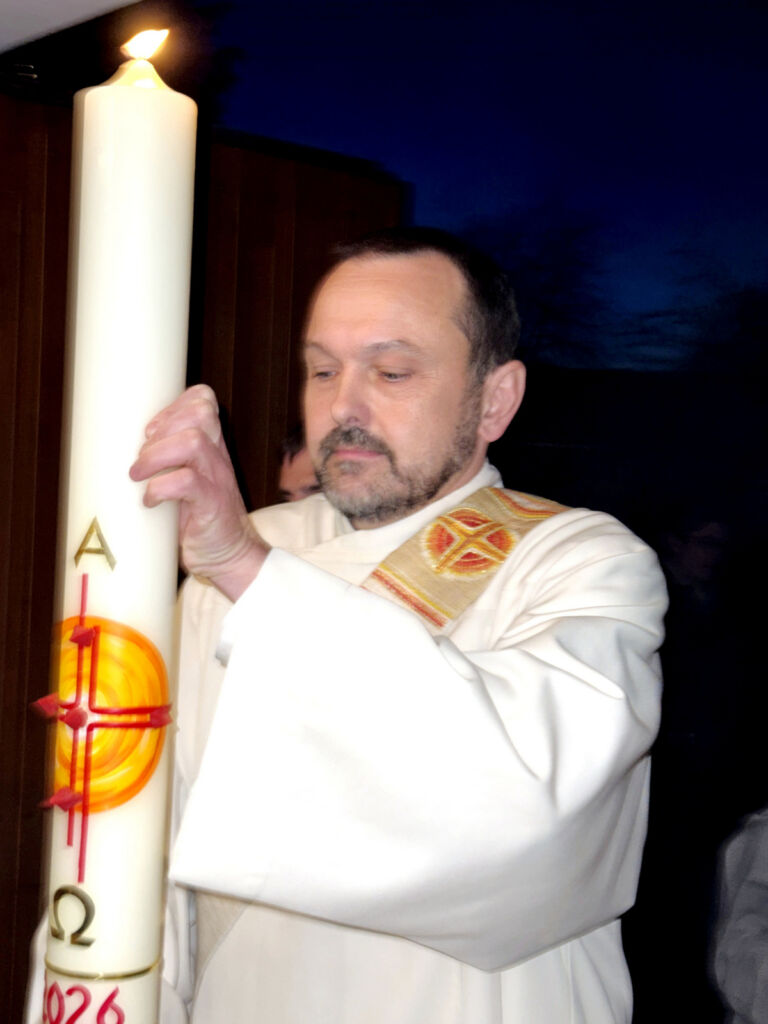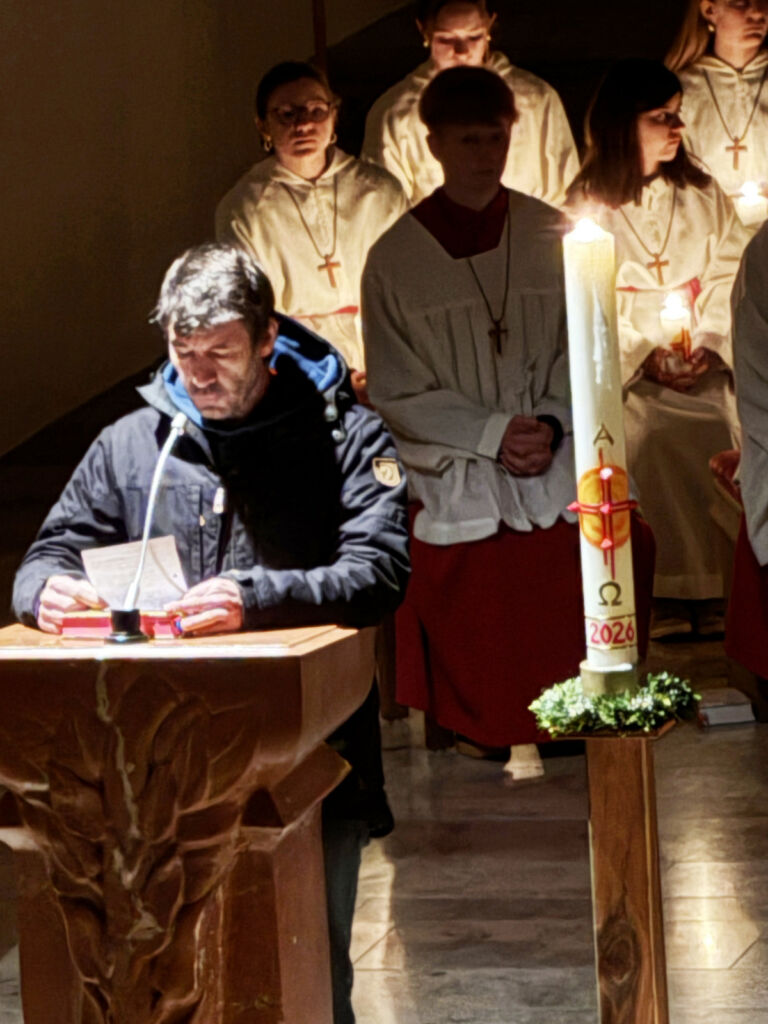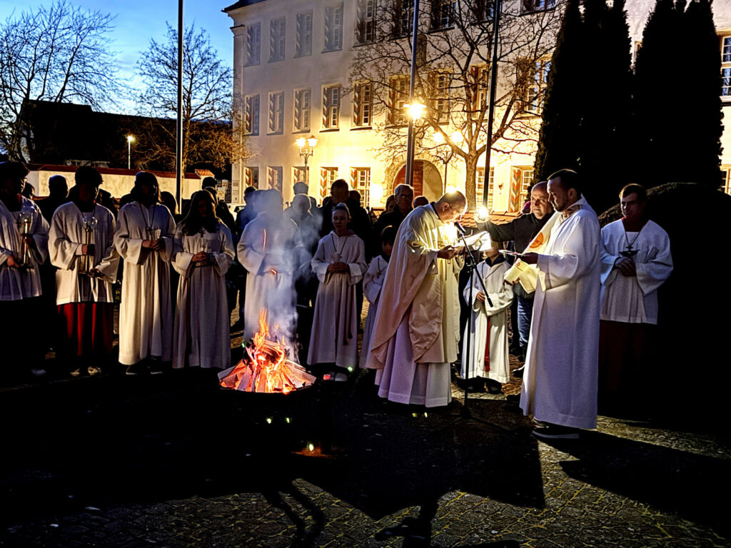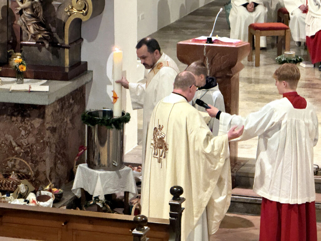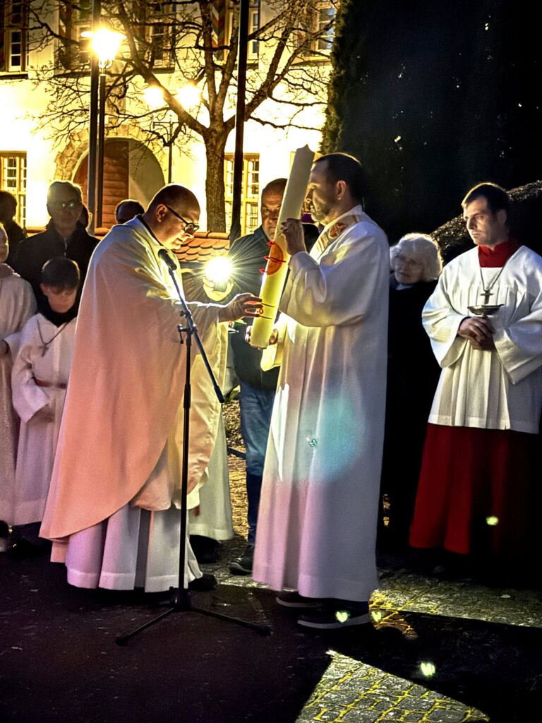 Der feierliche Einzug in die noch dunkle Kirche wurde nur durch Kerzenschein erhellt. Nach dem Osterlob („Lumen Christi“) folgte der Wortgottesdienst mit vielen Lesungen und Erklärungen zur zentralen Bedeutung der Auferstehung Jesu für uns alle.