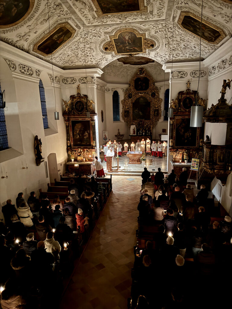 Haisterkirch – Recht viele Gläubige aus dem ganzen Nahbereich der Seelsorgeeinheit Bad Waldsee waren nach Haisterkirch gekommen, um hier im Gotteshaus St. Johannes Baptist an der Feier der Osternacht teilzunehmen. Traditionsgemäß hatte Hans Peter Waibel bei beginnender Dunkelheit auf dem Vorplatz der Kirche das Oster-Feuer mit speziell angefertigten Holzstücken in einer Schale angezündet.