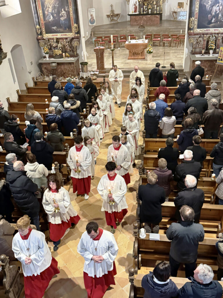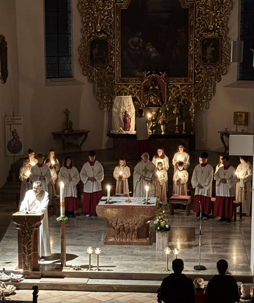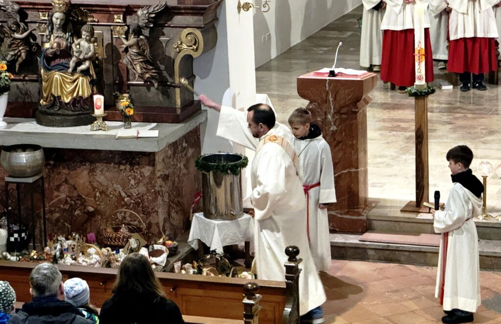 Im Zusammenhang mit der Weihe des Taufwassers wurde das Taufversprechen erneuert, also das Glaubensbekenntnis erneut dokumentiert. Die folgende Eucharistiefeier, zelebriert von Pater Hubert Vogel, wurde gesanglich und musikalisch sehr feierlich von Verena Westhäußer umrahmt. Zu Beginn des Gottesdienstes gelang es ihr feinstimmig, die Dunkelheit mit besinnlichem Gesang zu repräsentieren.