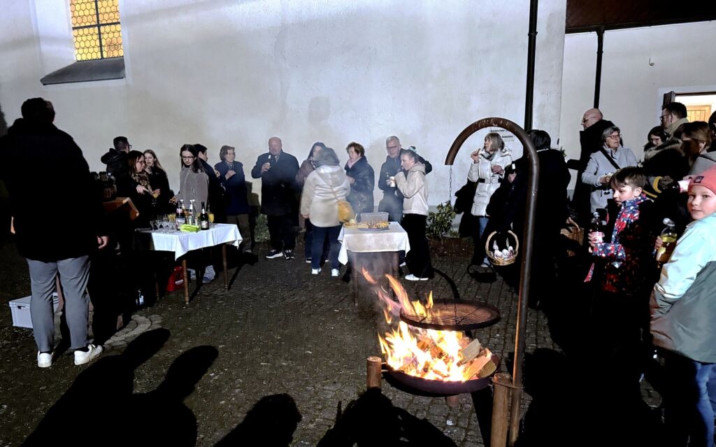 Zuerst versammelte sich die 20-köpfige Ministrantenschar um das Feuer und dahinter reihte sich die große Schar der Gläubigen ein. Diakon David Bösl und Pater Hubert Vogel, der auch das Feuer segnete und die Osterkerze symbolhaft mit fünf Nägeln für die Wunden Jesu bestückte , hatten Gebete im Freien vorgetragen. Die Osterkerze wurde danach an der Feuerstelle entzündet.