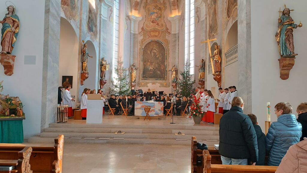 Reute-Gaisbeuren – Einem Konzertsaal glich die lichtdurchflutete Wallfahrtskirche St. Peter und Paul, Reute am zweiten Weihnachtsfeiertag. Schon geraume Zeit vor Gottesdienstbesuch strömten viele Gläubige und Musikbegeisterte zur weihnachtlich geschmückten Kirche. Dieses war auch gut, denn nicht mehr alle Teilnehmer bekamen einen guten Bankplatz.