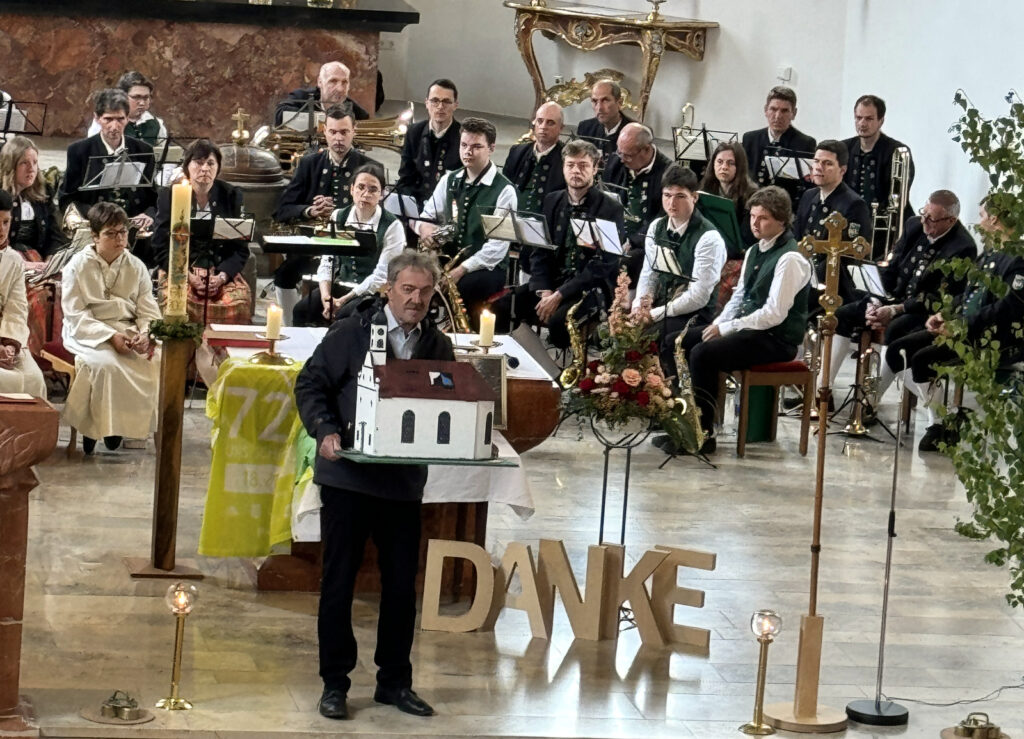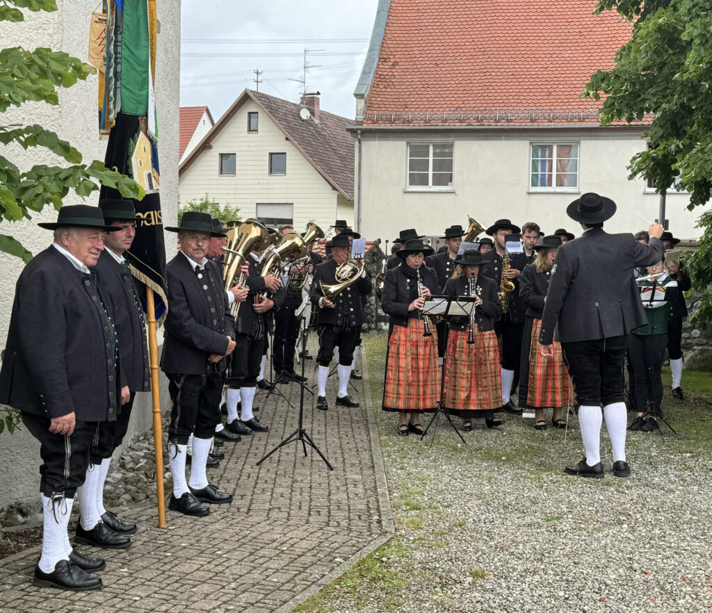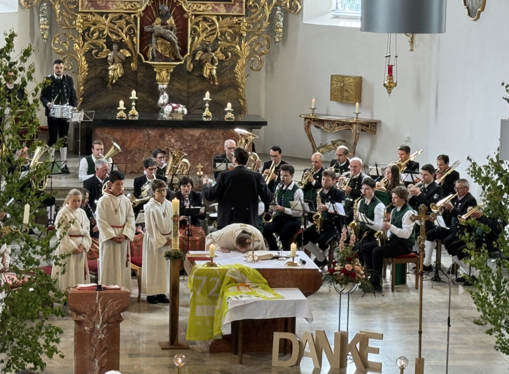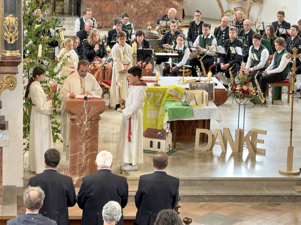 Pfarrer Stefan Werner bedankte sich am Schluss der Feier auf dem Friedhof – kurz bevor eine gewaltiger Regenguss niederging – bei allen, die zum würdigen Begehen des kirchlichen Hochfestes in irgendeiner Weise beigetragen haben. Dazu gehörten die professionelle, musikalische Umrahmung durch die Musikkapelle unter dem Dirigat von Klaus Wachter, das feine Orgelspiel mit Gesang durch Verena Westhäußer, das Anbringen der Blumentafeln im Mittelgang der Kirche, die Dienste der Minis, die Mesnerdienste und besonders das wichtige Mitwirken der Ehrenamtlichen. Er wünschte bei der Segensbitte mit der Monstranz, dass der „verlängerte“ Segen Gottes, den Menschen hier am Ort und der Menschheit insgesamt gewährt werde.