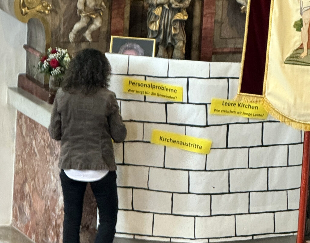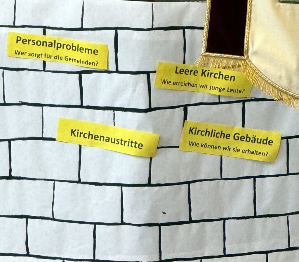 Aktuelle Bezüge zu den Sorgen, die die Kirchenleitungen aber auch gerade die ehrenamtlichen Mitarbeiterinnen und Mitarbeiter der hiesigen Kirchengemeinde momentan bedrücken, zeigten welche von ihnen anschaulich auf. An einer „Klagemauer“ hefteten sie Schlagzeilen an, die sicher auch beim bevorstehenden pastoralen Besuch des Dekans vorgebracht werden.
