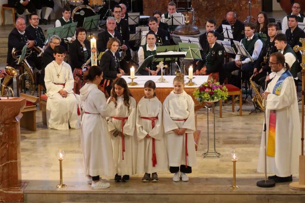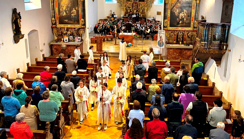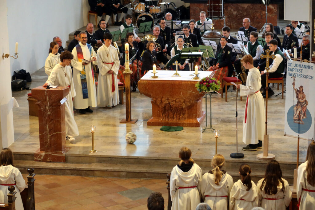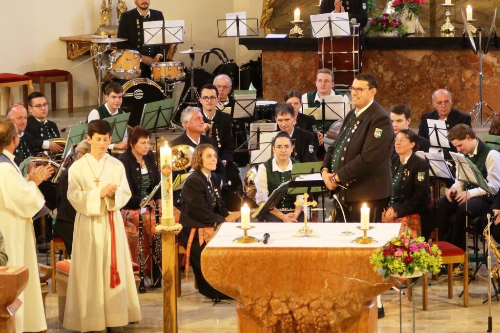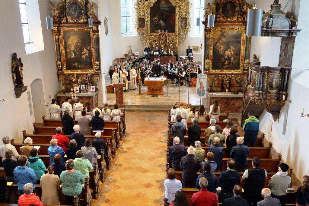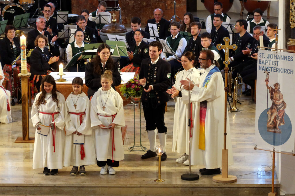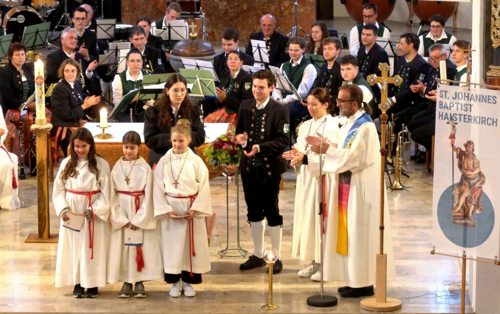 Im Rahmen des Gottesdienstes wurden drei Ministrantinnen vorgestellt und in die große Schar der Haisterkircher Minis eingegliedert. Dafür gab es kräftigen Beifall. Riesigen Applaus ernteten nicht nur Minis, Lektorinnen und Lektoren dieser Patroziniumsfeier nach dem Dankeschön von Pfarrer Stefan Werner, sondern geradezu überwältigend auch die Musikerschar, als der Priester erwähnt hatte, dass die Haisterkircher Musikkapelle beim erst kürzlich erfolgten Wertungsspiel mit „Hervorragend“ benotet worden war. Eine Kostprobe ihres Könnens gab die Musikkapelle unter Klaus Wachters Dirigat als Zugabe nach der Patroziniumsfeier mit schmissigen Klängen, die den gesamten Kirchenraum ausfüllten.
