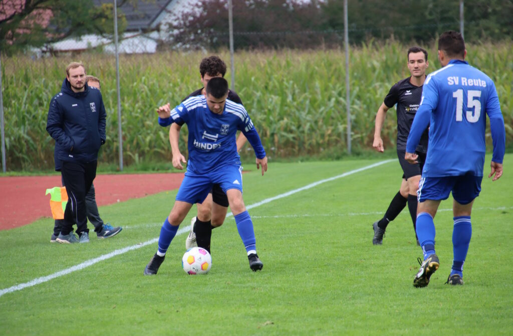 Die Heimpartie gegen die SGM Blitzenreute/Mochenwangen II begann für den Gastgeber nach Maß, als der agile Noah Geiselhart in der vierten Minuten beim Torabschluss im Strafraum gefoult wurde. Den fälligen Elfmeter verwandelte Kevin Kraus sicher zum 1:0. Irgendwie tat die Führung dem Reutener Spiel jedoch gar nicht gut und die Gäste kamen immer besser in die Partie. Zu allem übel musste auch noch Noah Geiselhart verletzungsbedingt früh vom Feld, bei den Gästen hatte es kurz zuvor Cenk Cakmak erwischt. Die Gäste zeigten sich auch weiterhin vom frühen Rückstand völlig unbeeindruckt und der SVR hatte eine brenzlige Situation im Strafraum zu überstehen. Fünf Minuten vor dem Halbzeitpfiff hatte der eingewechselte Benjamin Porteous die dicke Chance auf den Ausgleichstreffer, verpasste aber das Reutener Tor knapp. Auf der anderen Seite kam endlich auch Reute wieder zu Möglichkeiten. Kevin Kraus scheiterte mit einem Freistoß am Keeper, Maximilian Heß setzte einen Kopfball knapp über den Querbalken. Unmittelbar vor dem Halbzeitpfiff kam Justin Matt im Gästestrafraum ins Straucheln und der Unparteiische zeigte zum zweiten Mal auf den Punkt. Kevin Kraus ließ sich das nicht entgehen und verwandelte mit seinem 8.Saisontreffer zum 2:0-Halbzeitstand.
